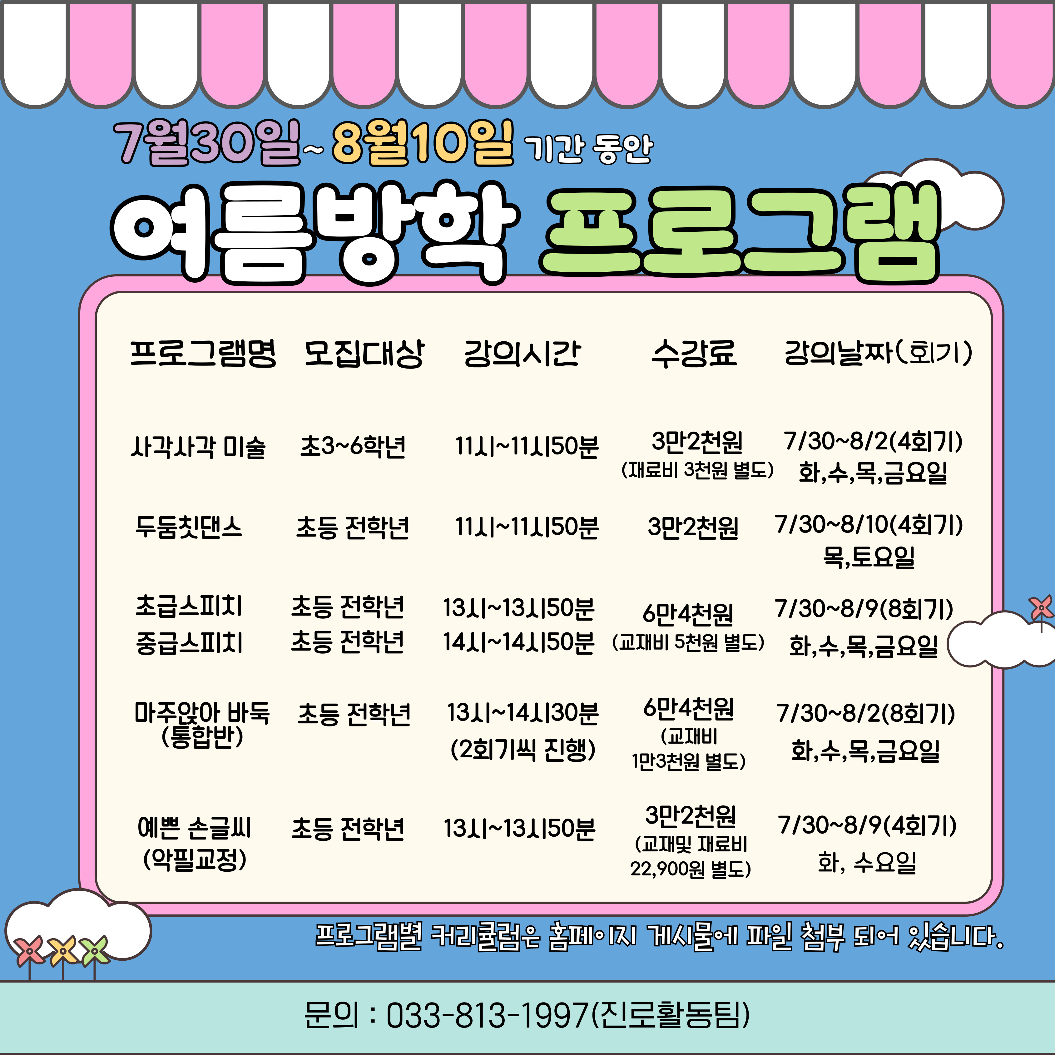 운영기간 : 7월 30일~ 8월 10일 화,수,목,금요일 2주간(프로그램별 상이/자세한 내용은 포스터 참조)