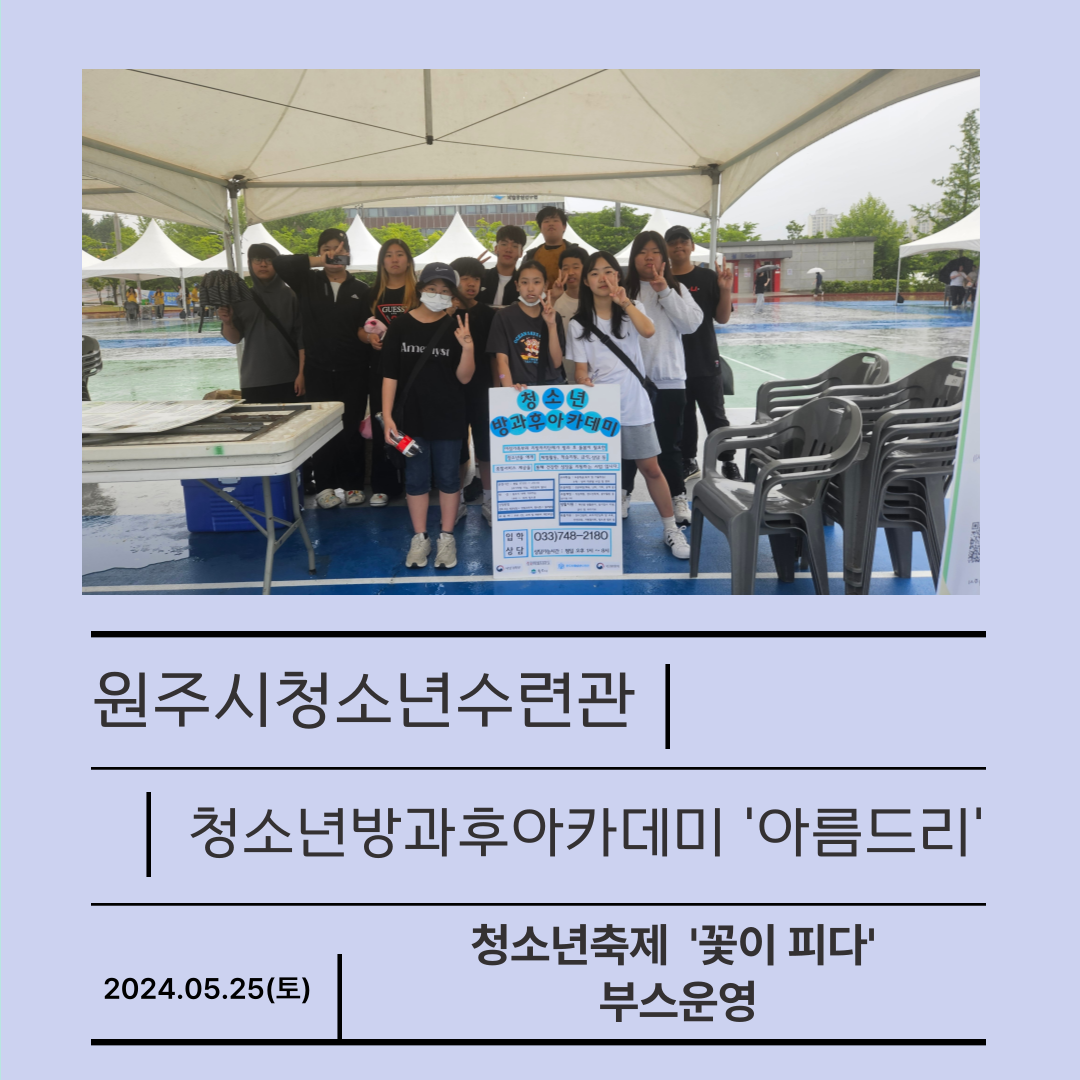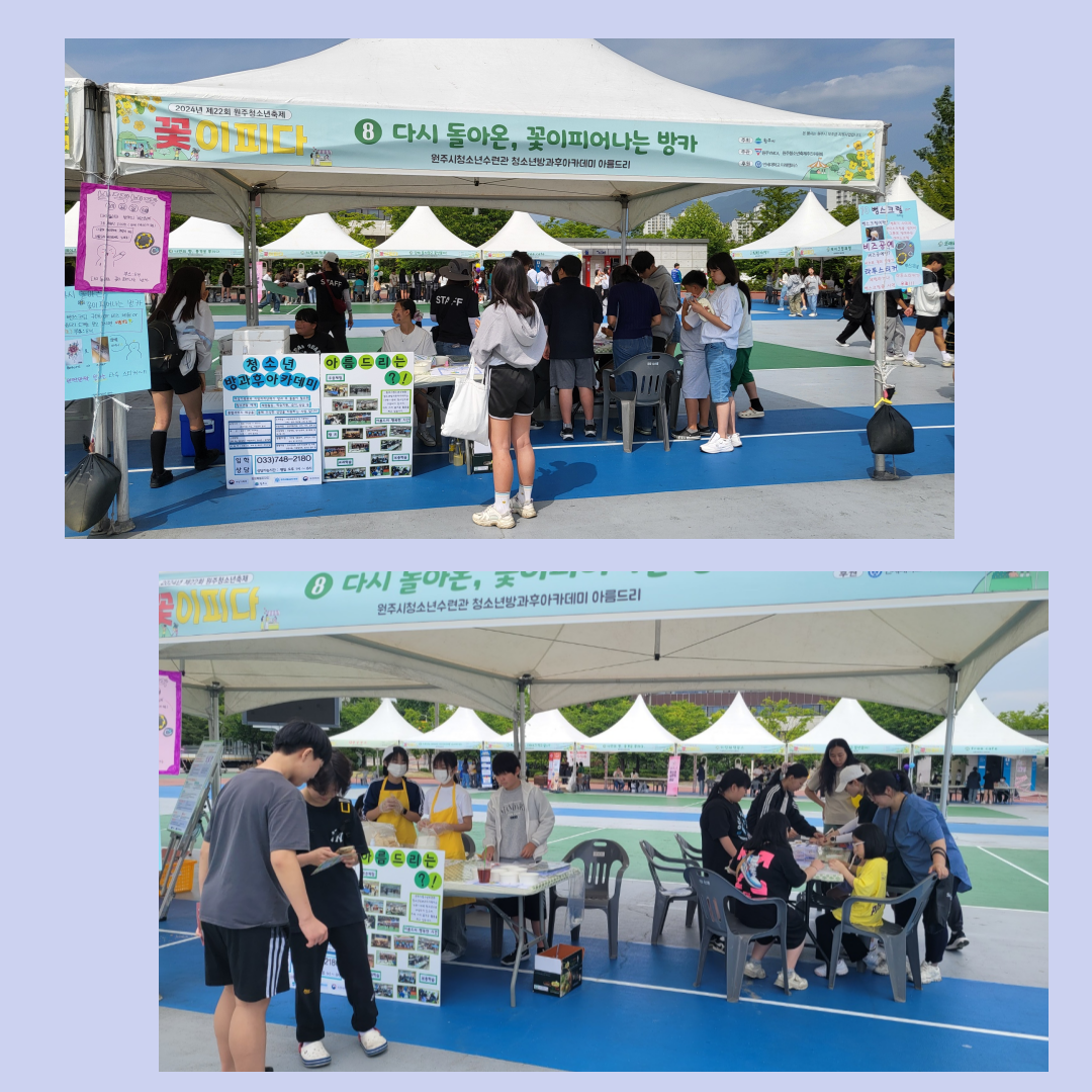 방과후아카데미 아름드리는  건전한 청소년문화를 확산하고 청소년들의 다양한 끼와 재능을 발산하는 원주청소년축제 '꽃이피다' 전시마당 부스 운영에 참여하여 청소년  및 지역사회가 함께 교류하는  새로운 경험을 하였다.