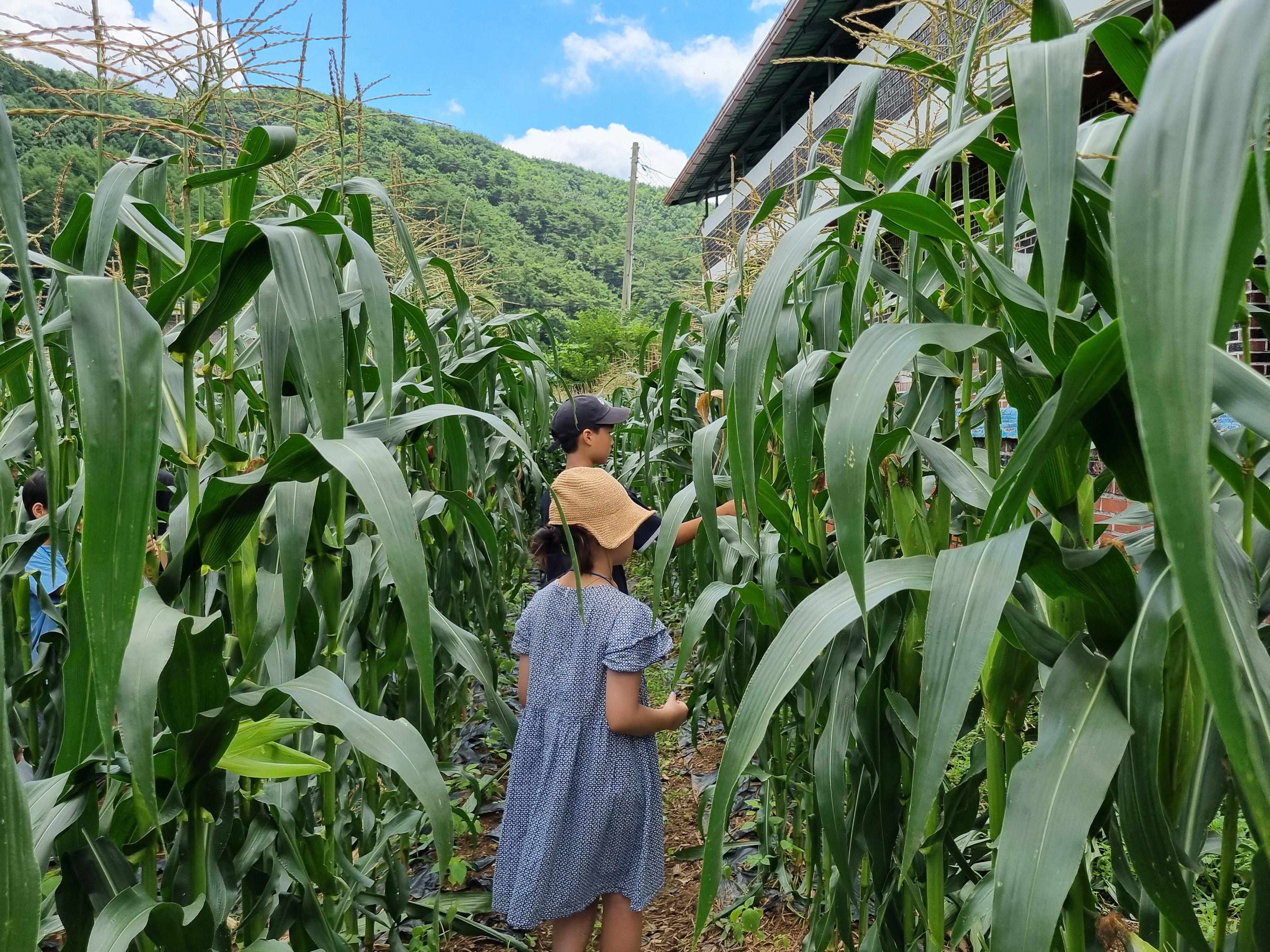 옥수수 수확 체험을 시작으로 천연염색으로 이쁜 손수건을 만들고 떡메치기 체험으로 맛있는 인절미를 만들어 먹고 시원한 블루베리 빙수까지 만들어 먹었습니다😀