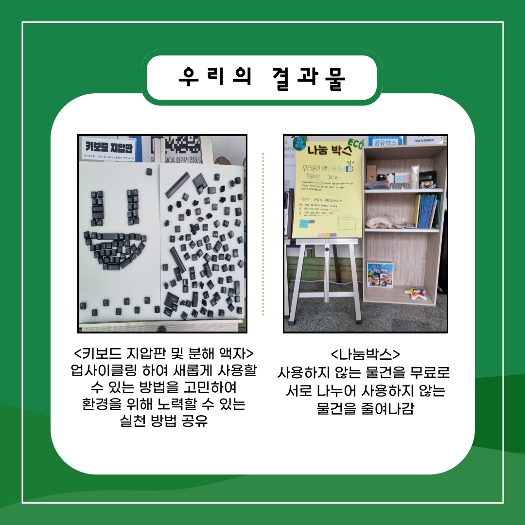 나눔박스와 키보드 지압판(업사이클링)을 결과물로 만들었고 지난 8일(목)에 초대한 청중앞에서 발표를 했습니다.
