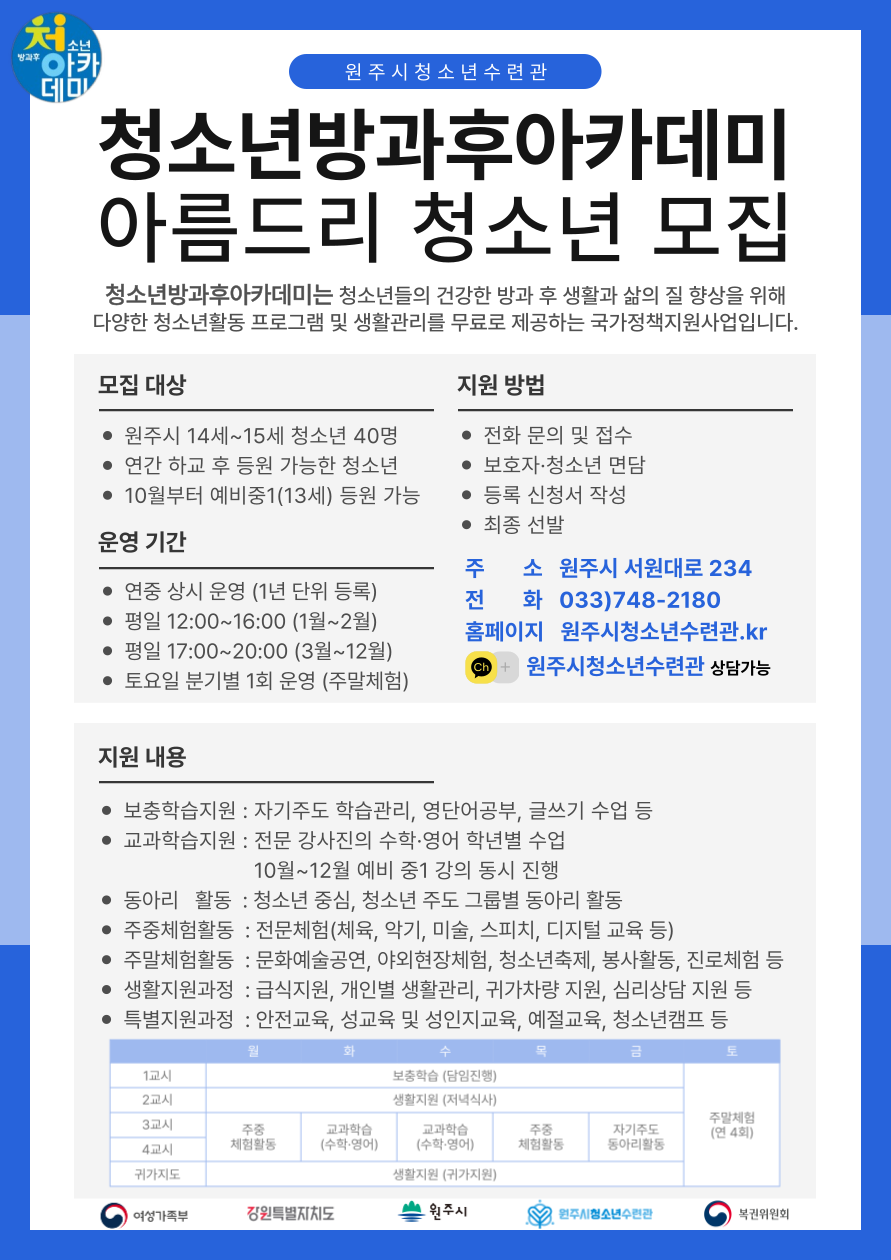 원주시청소년수련관 청소년방과후아카데미 청소년 모집