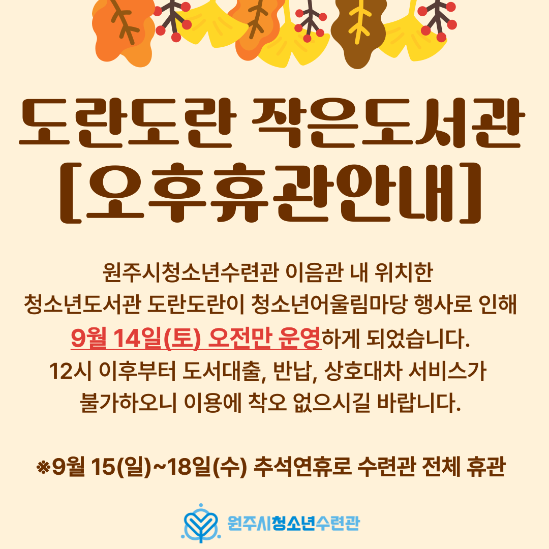 우리 기관 내 도란도란 작은도서관이 9월 14일(토) 행사운영지원으로 인해 오전만 운영하게 되었습니다.