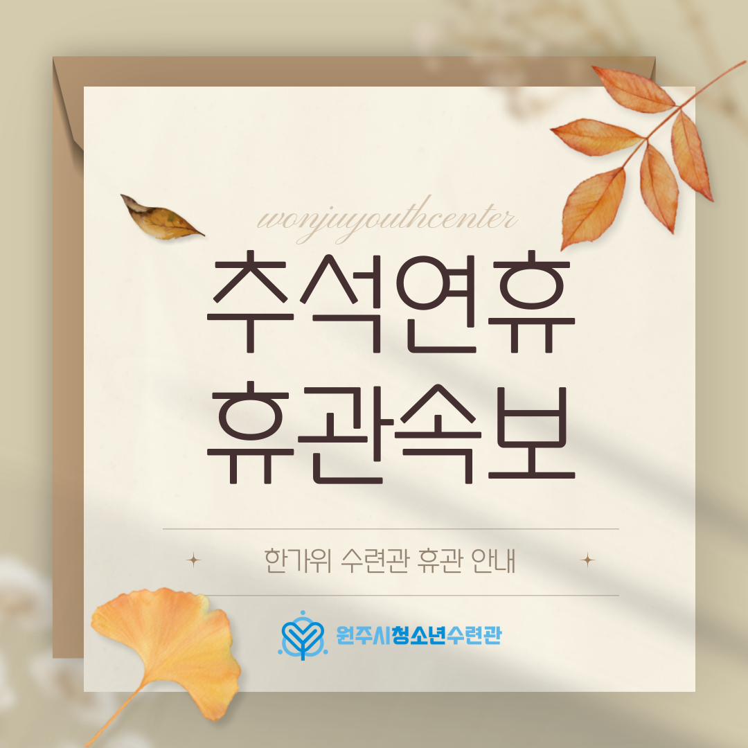원주시청소년수련관이 추석연휴를 맞아 휴관에 들어갑니다.