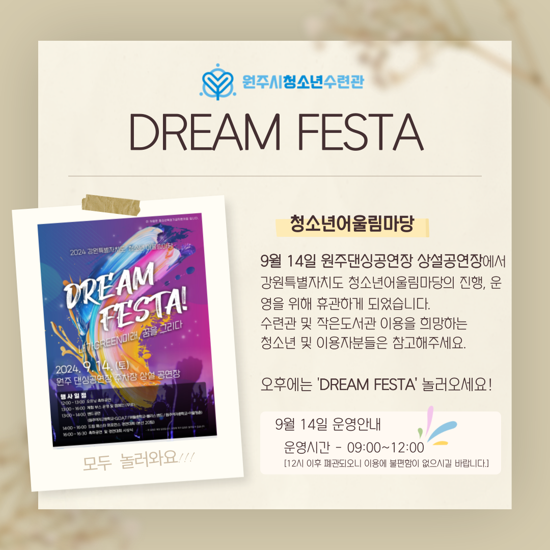 9월14일(토) : DREAM FESTA! 강원특별자치도청소년어울림마당 운영 및 진행으로 인하여 당일 09:00~12:00 오전만 운영하고 12시부터 폐관됩니다.