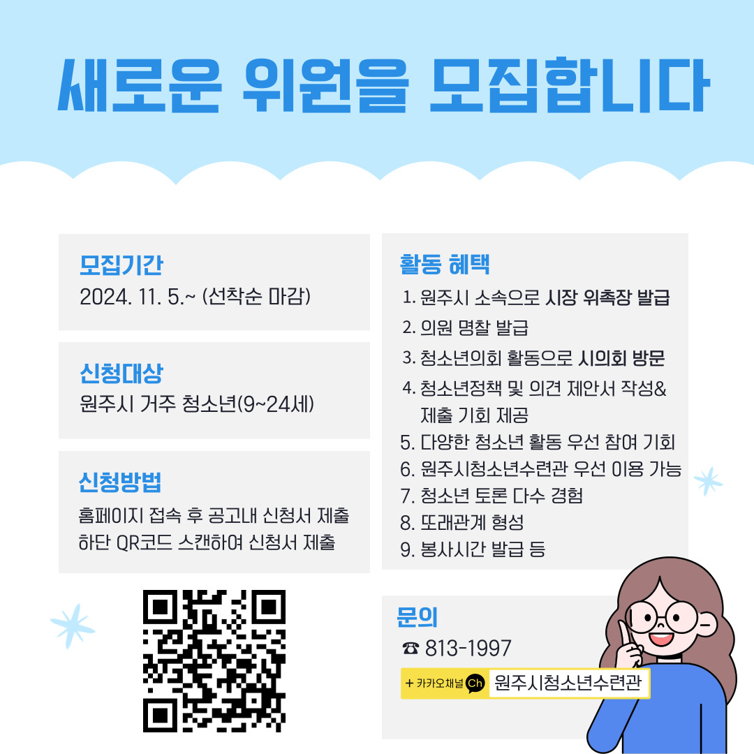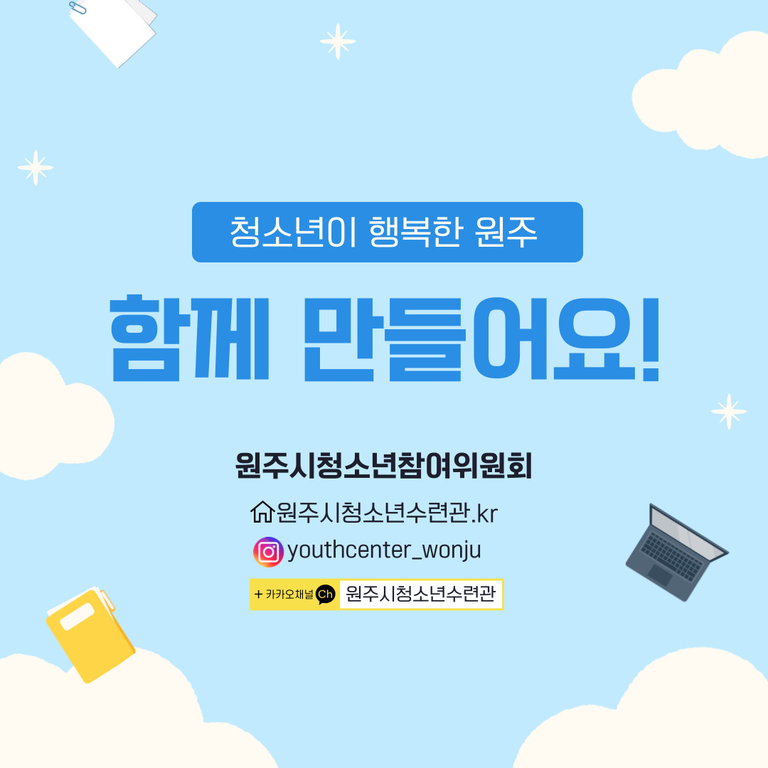 - 문의: 813-1997 또는 카카오채널 '원주시청소년수련관'