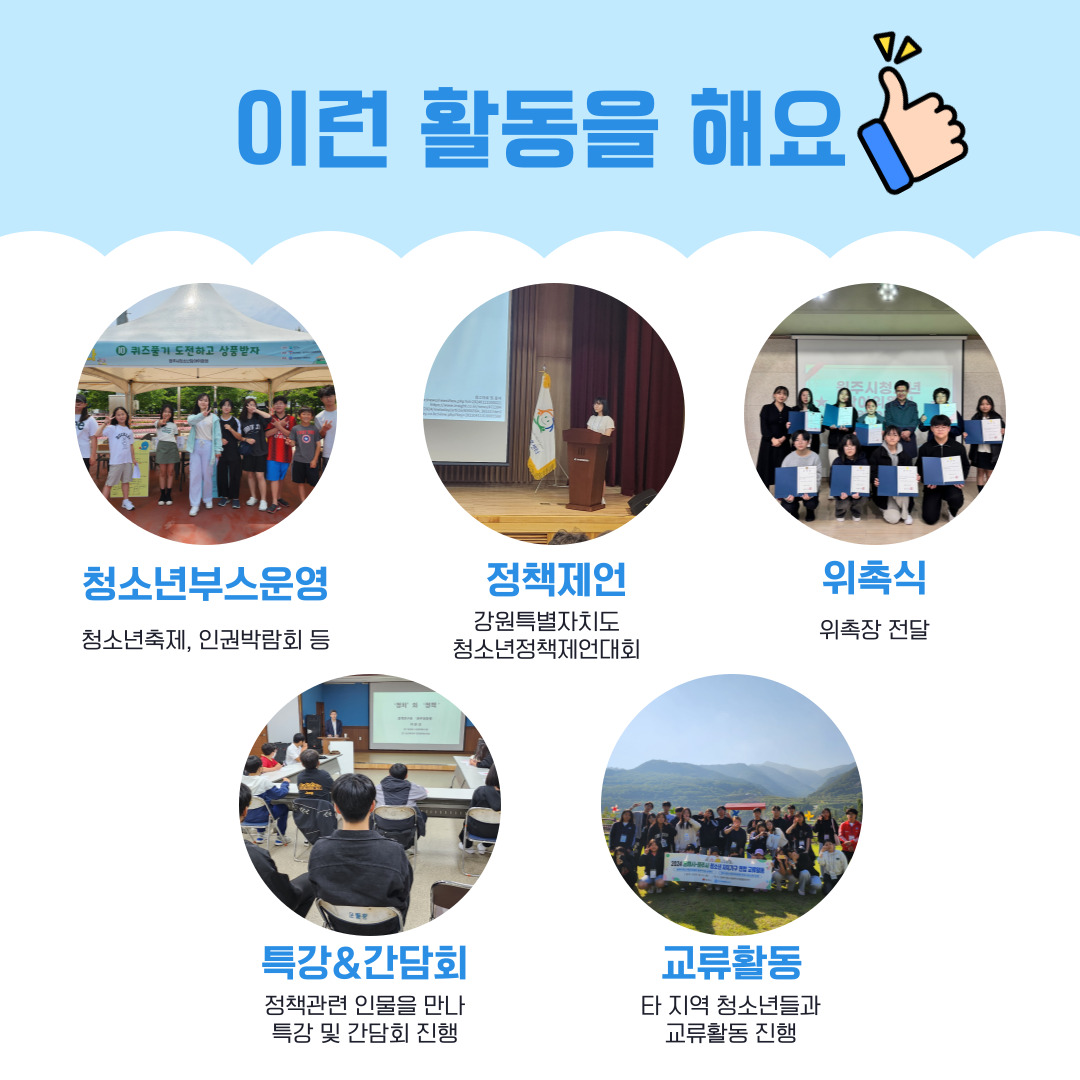 - 활동내용: 월 2회 정기회의 및 청소년활동 참여, 청소년의회 활동 등