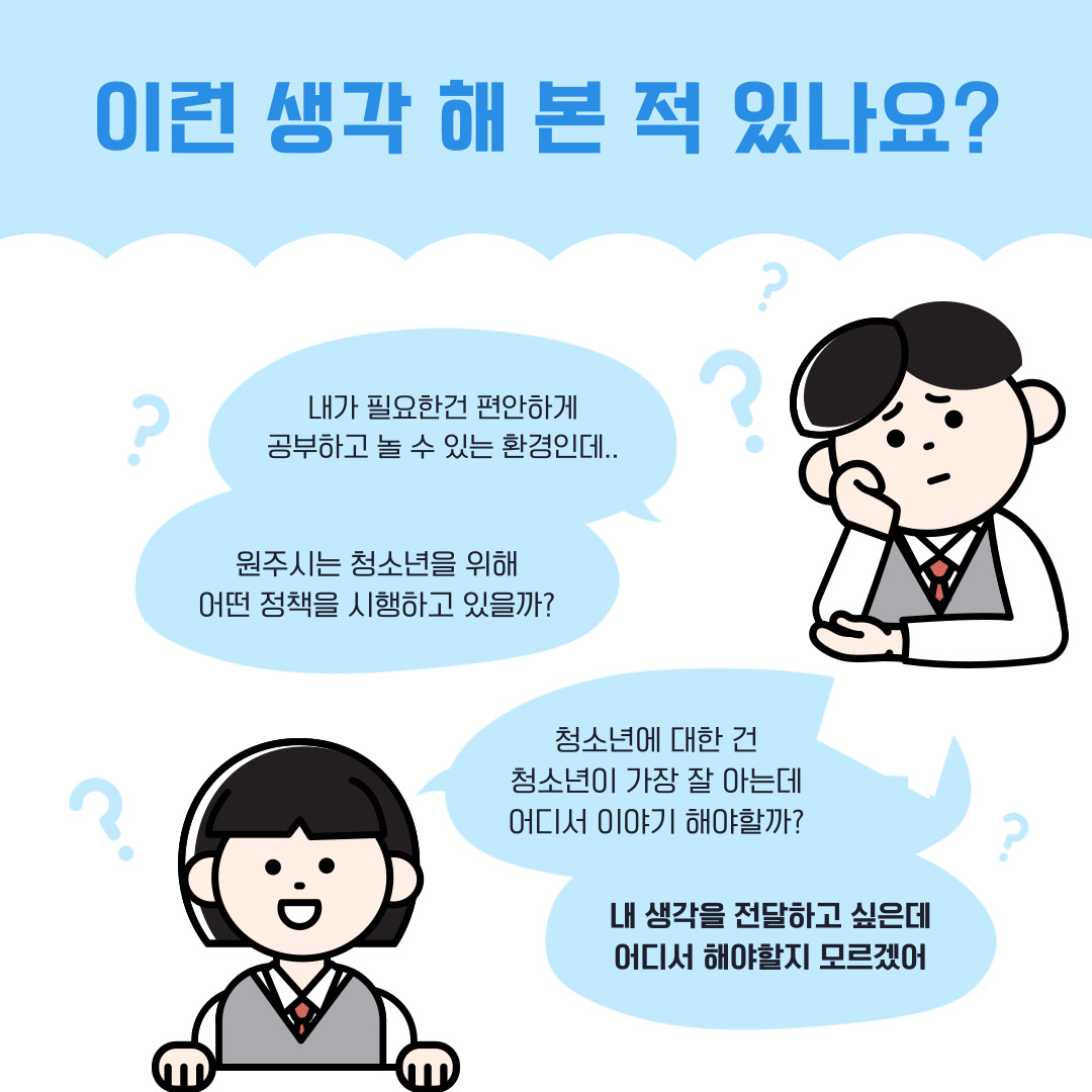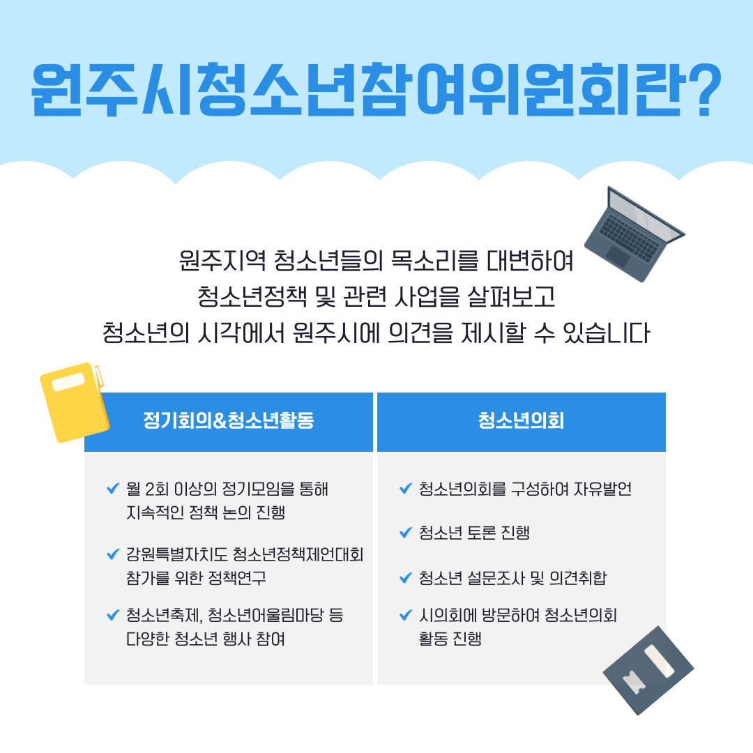 원주시 청소년을 대표하여 원주시에 청소년의 의견을 제시하고 정책제안을 할 수 있는 자치기구인