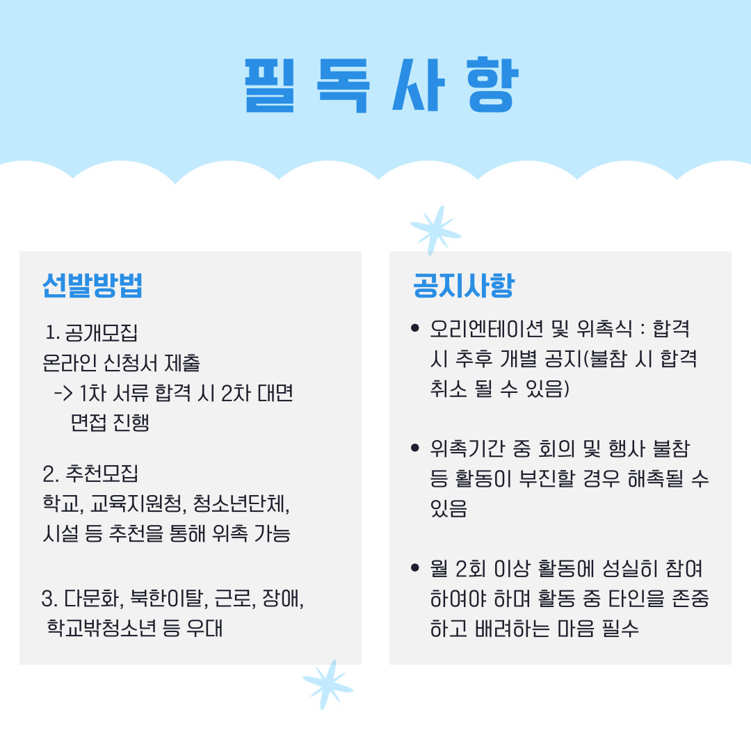 아래 사항을 꼼꼼히 읽어보신 후 지원서 작성 바랍니다. 감사합니다 :) | 선발절차 및 방법 1. 모집대상: 원주에 거주하는 만 9세~24세 청소년 2. 선발전형 가. 공개모집(당연직) - 모집기간: 선착순