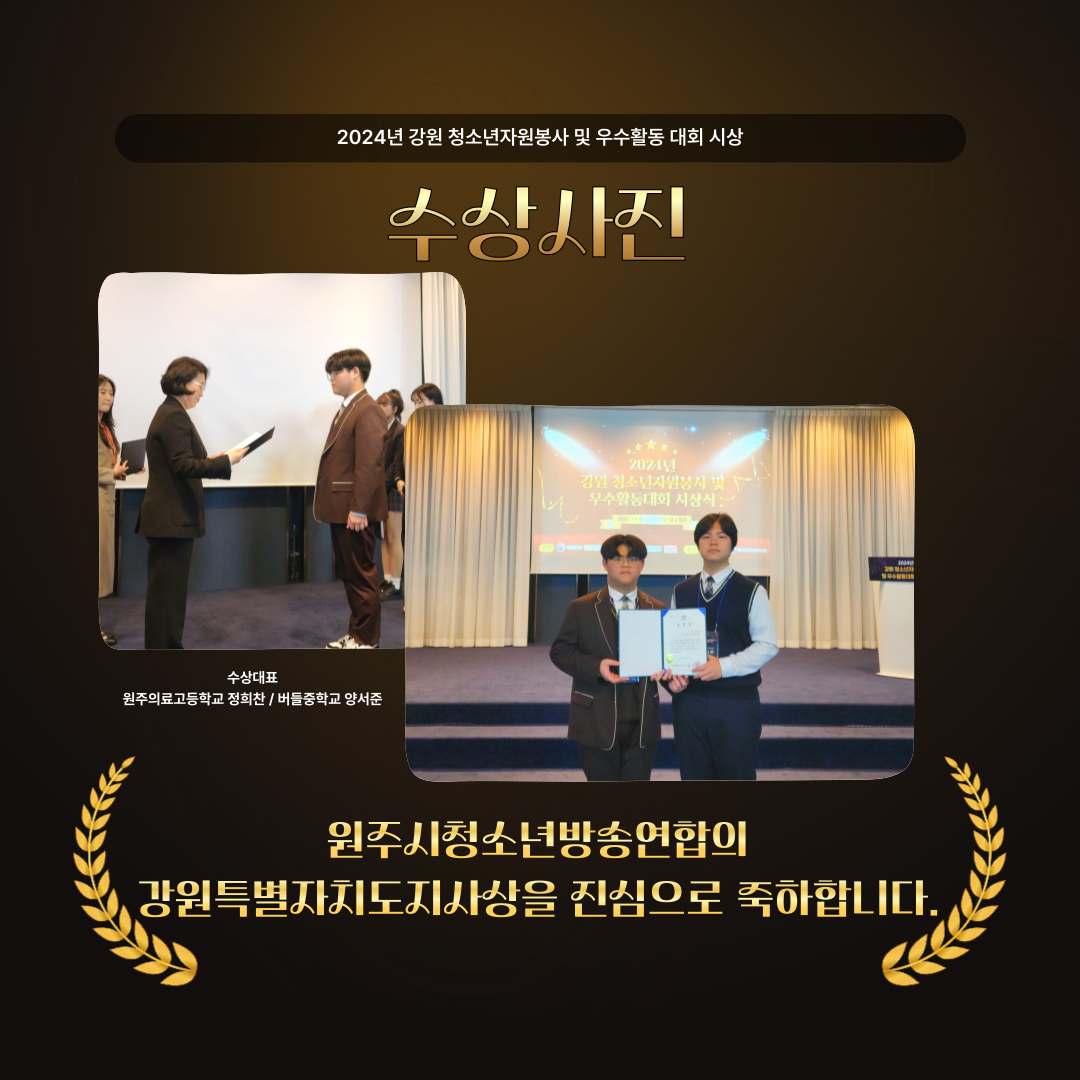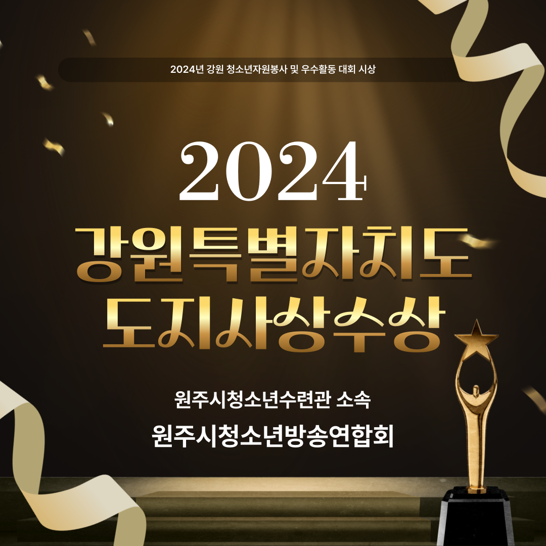 원주시청소년수련관(원주YMCA) 소속 동아리 원주시청소년방송연합회가 강원특별자치도지사상을 수상했습니다.