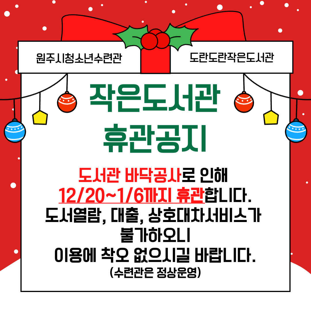 도서관 바닥공사로 인해 12월 20일부터 내년 1월 4일까지 약 2주간 작은도서관을 잠시 닫게 되었습니다.