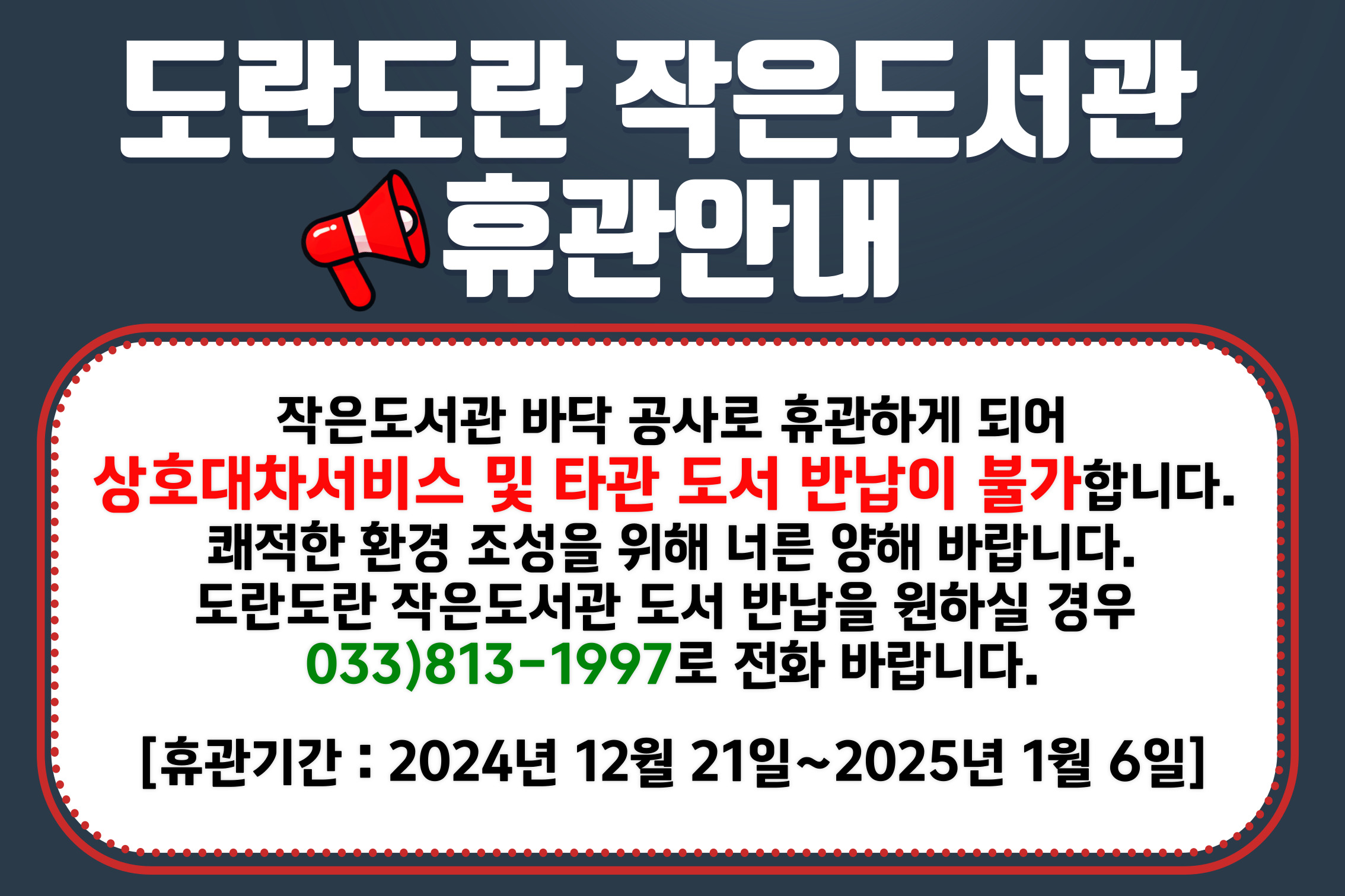 ✔️도란도란 작은도서관의 도서 반납시 9시~18시 내 작은도서관 방문 또는 813-1997 전화 문의