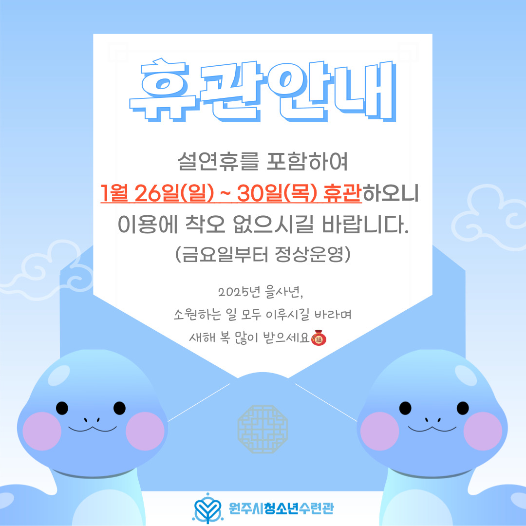 안녕하세요 원주시청소년수련관입니다. 설 연휴 휴관 안내 드립니다.