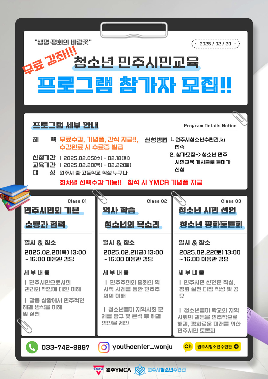 "생명·평화의 바람꽃" 청소년 민주시민교육 *프로그램 세부 안내 신청기간 : 2025.02.05(수) ~ 02.18(화) 교육기간 : 2025.02.20(목) ~ 02.22(토) 대 상 : 원주시 중·고등학교 학생 누구나 비 용 : 무료 문의) 0