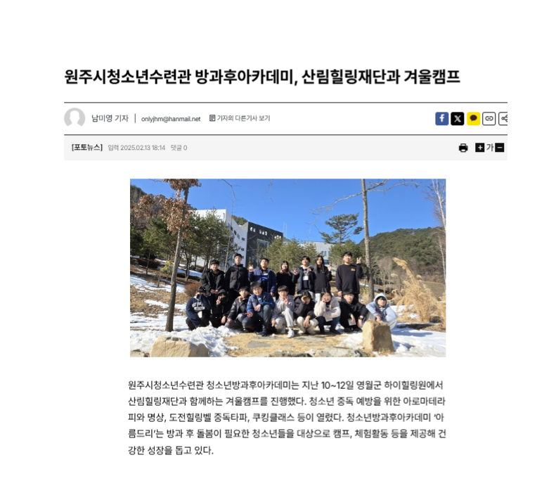 보도링크  원주시청소년수련관 방과후아카데미, 산림힐링재단과 겨울캠프 < 포토뉴스 < 원주24시 < 기사본문 - 원주투데이