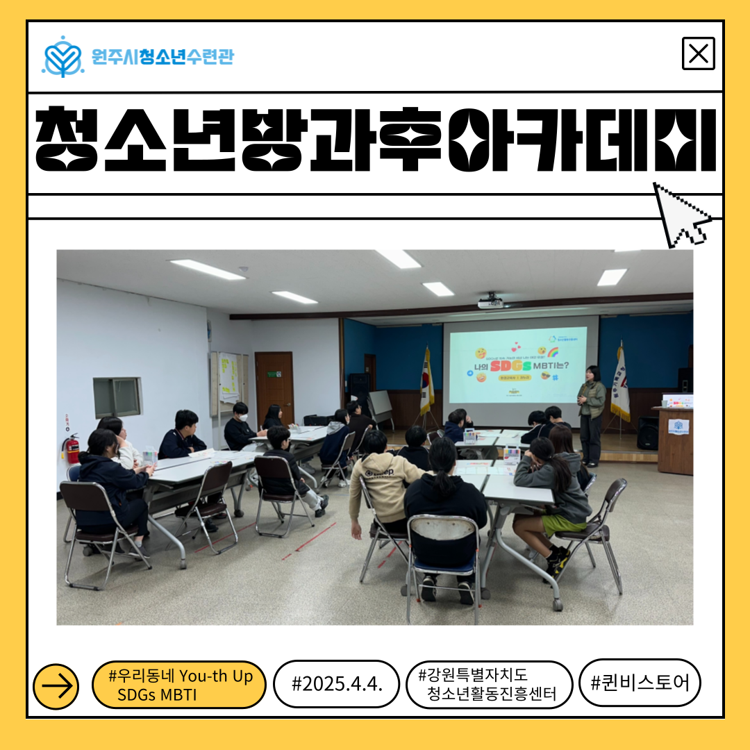 방과후아카데미 아름드리는 강원특별자치도청소년활동진흥센터, 지속 가능한 플랫폼 퀸비스토어와 연계하여 우리동네 Youth-Up SDGs MBTI을 진행했습니다.