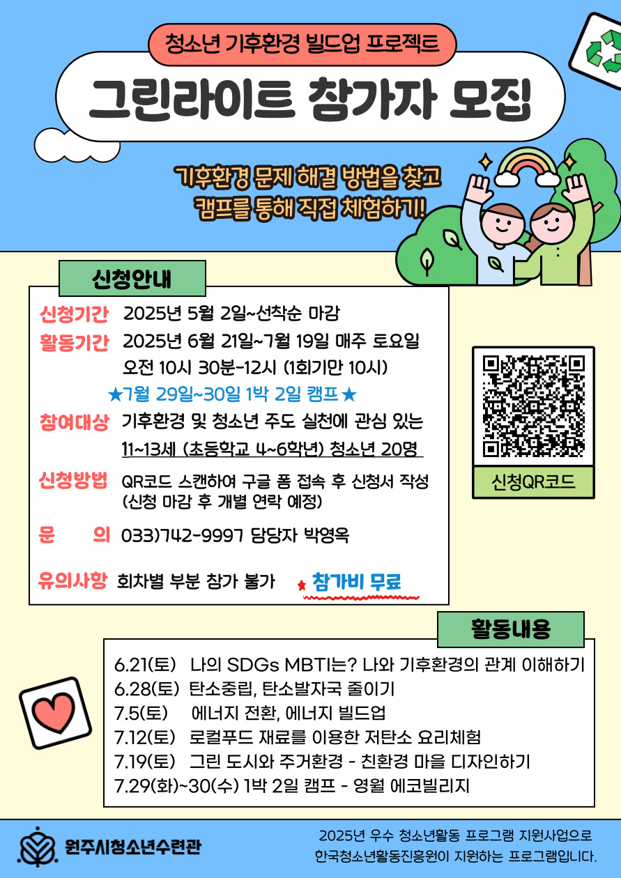 원주시청소년수련관이 올해 한국청소년활동진흥원 우수 청소년활동 지원사업에 선정되어 <청소년 기후환경 빌드업 프로젝트 그린라이트> 활동을 진행하게 되었습니다.
