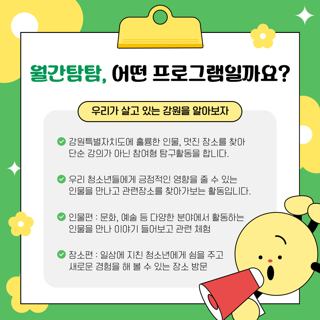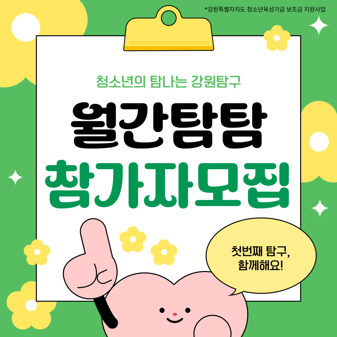 작년에 이어 올해도 청소년들의 탐나는 강원 탐구 '월간탐탐'을 진행하게 되었습니다😊