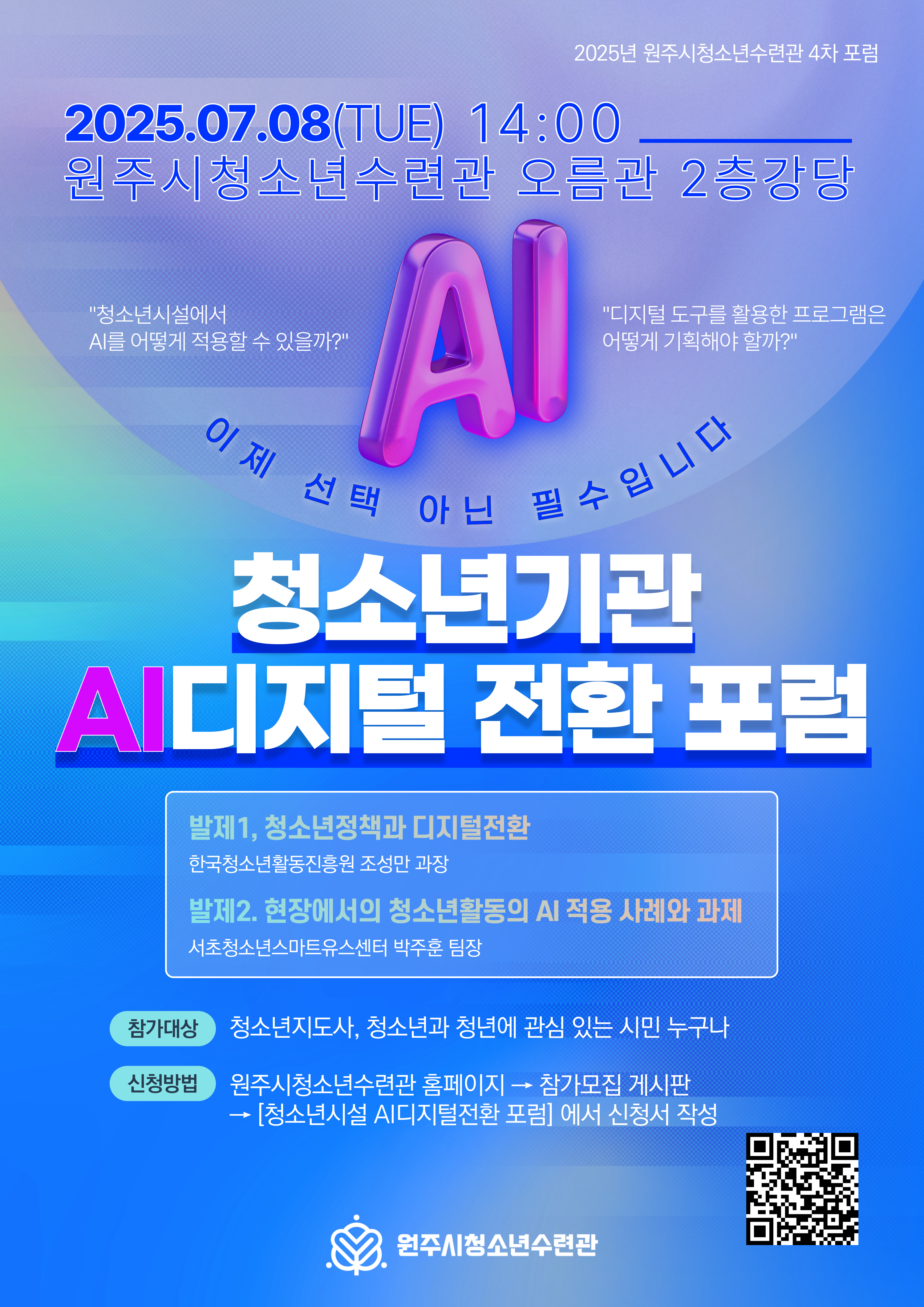 2025년 7월 8일(화) 오후 2시부터, 원주시청소년수련관 오름관 2층 강당에서는 '청소년기관 AI디지털 전환 포럼'이 개최됩니다. 이번 포럼은 지역 청소년시설의 디지털 전환 흐름 속에서, 실질적인 정책 방향과 현장 적용 사례를 통해 우리의 현재와 미래를 함께 고민해보는 자리입니다.