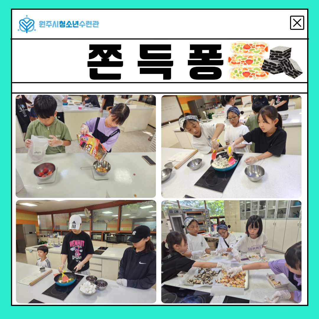원주시청소년수련관에서 원청수랜드 여름방학 특별 원데이클래스 쫀득퐁 프로그램이 마무리 되었습니다. 청소년들이 함께 쫀득쿠키를 만들며 달콤한 시간을 보냈습니다.
