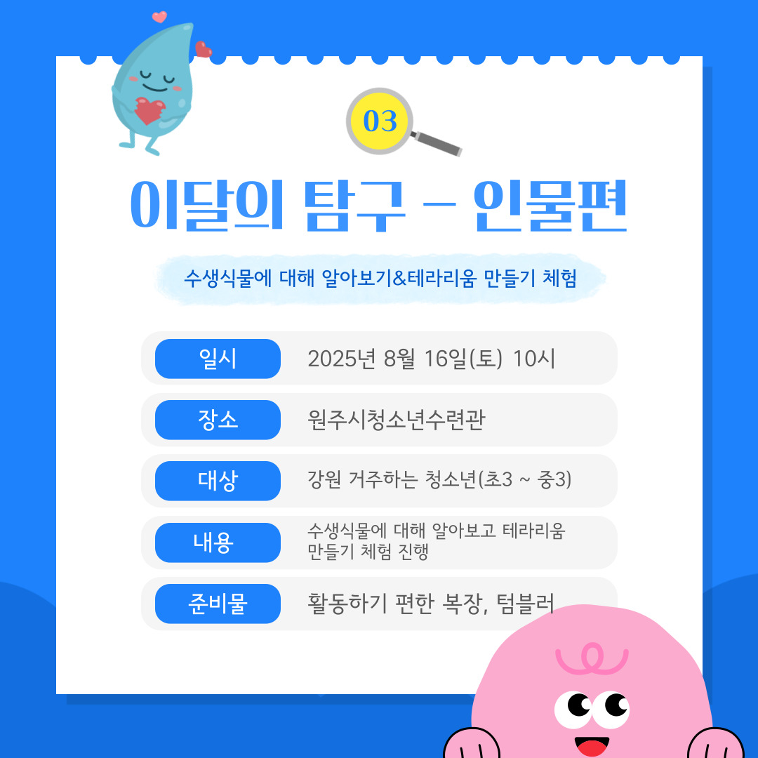 우리 프로그램에 관심과 참여에 감사드립니다. 아래 일정을 참고하시어 신청 바랍니다😊 ✨일시 : 2025년 8월 12일 10시 20분, 16일 10시 수생식물 알아보기,테라리움 만들기체험 ✨대상 : 초등 3학