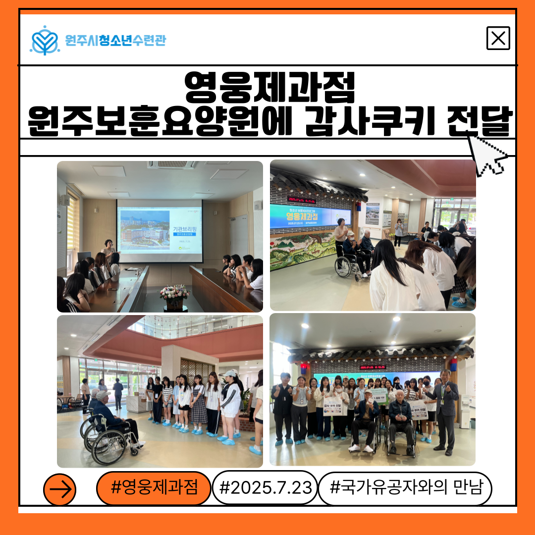 7/23(수) 감사 쿠키 만들어 원주보훈요양원에 방문하여 국가유공자분들께 감사카드와 쿠키를 전달했습니다.