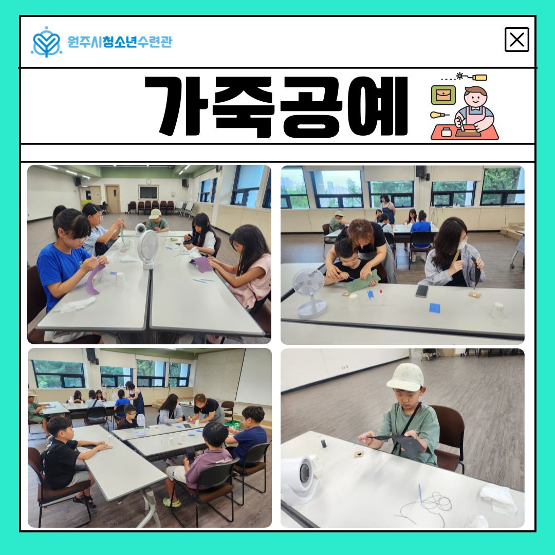 원주시청소년수련관에서 원청수랜드 여름방학 특별 원데이클래스 가죽공예 프로그램이 마무리되었습니다. 처음 가죽을 만지고 바느질 할때 낯설고 어려워했지만, 점차 하나하나 자신만의 손길이 더해지며 세상에 단 하나뿐인 지갑이 완성되었습니다. 이번활동을 통해 청소년들은 자신의 손으로 무언가를 완성해내는 성취감을 경험할 수 있습니다.