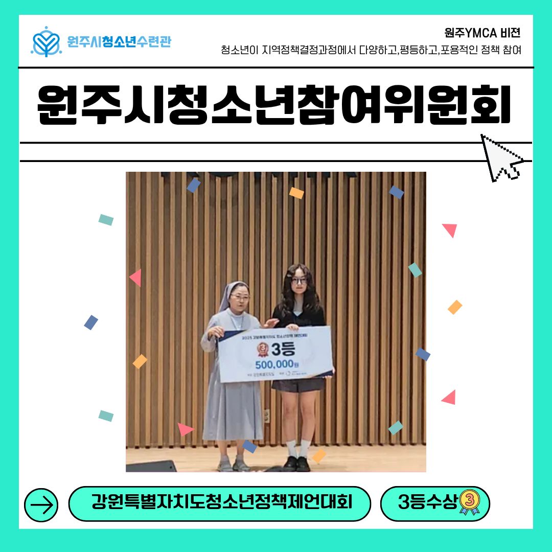 지난 8월초 열린 강원특별자치도청소년정책제언대회에 우리 원주시청소년참여위원회 김다혜위원이 본선에 오를 뿐 아니라 3등을 수상했습니다🎉🎉🎉