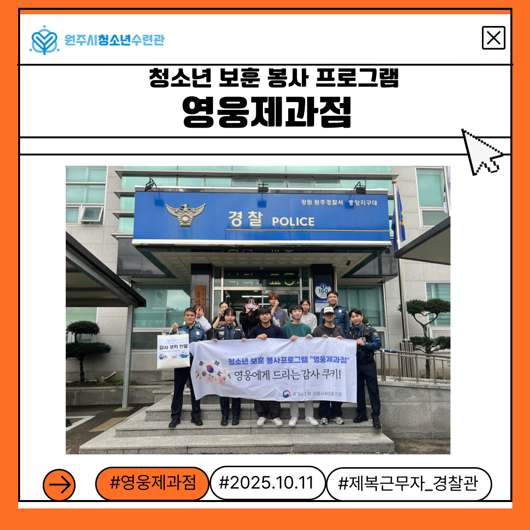 참여청소년들의 감사의 마음을 꾹꾹 담은 손편지와 쿠키를 정성스럽게 포장하여, 원주경찰서 중앙지구대에 전달드렸습니다.