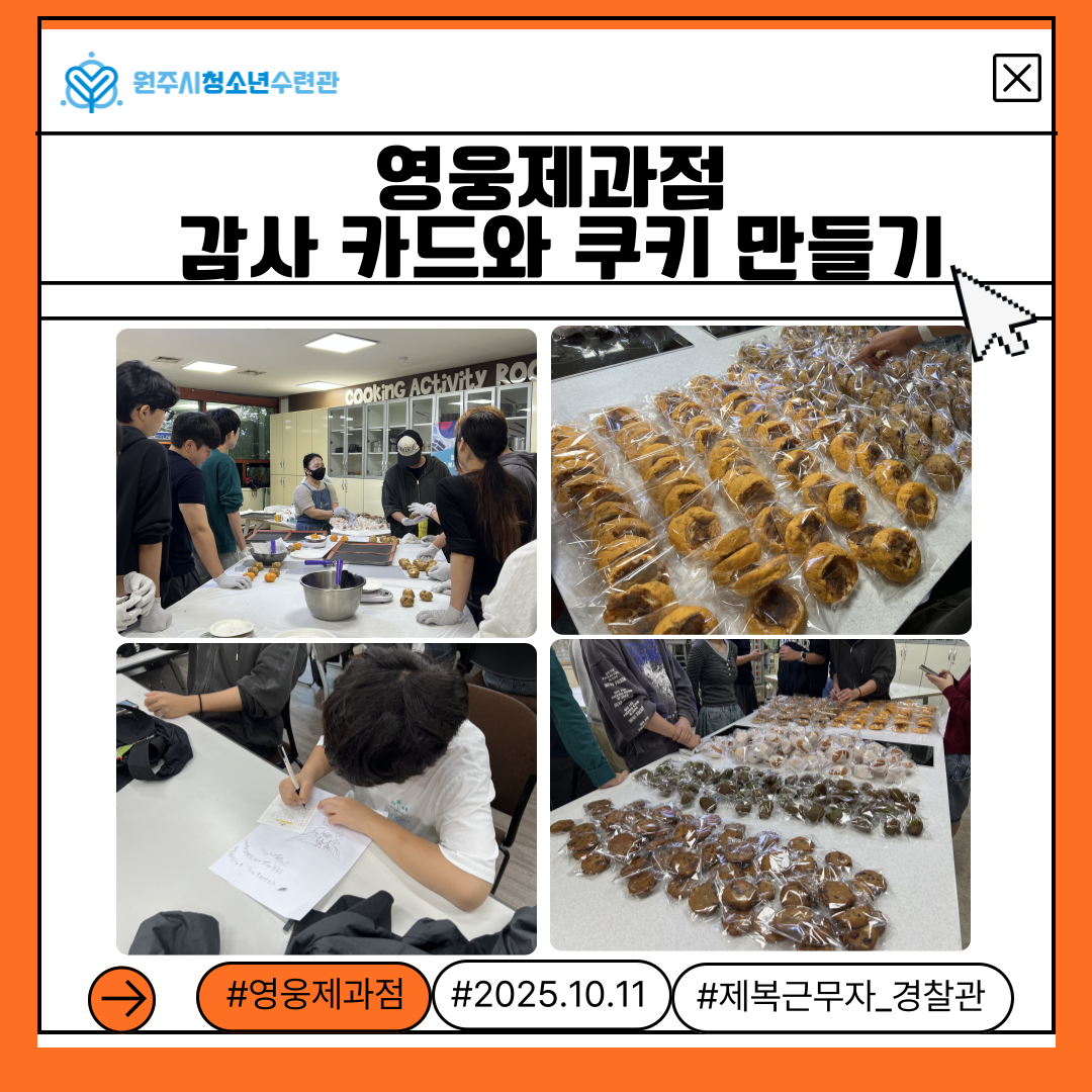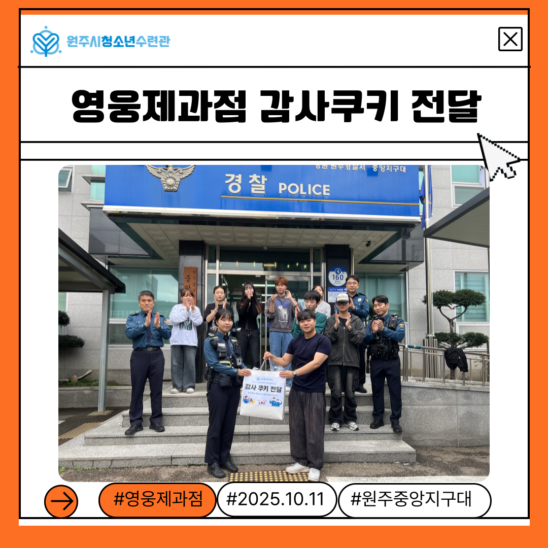 참여청소년들의 감사의 마음을 꾹꾹 담은 손편지와 쿠키를 정성스럽게 포장하여, 원주경찰서 중앙지구대에 전달드렸습니다.