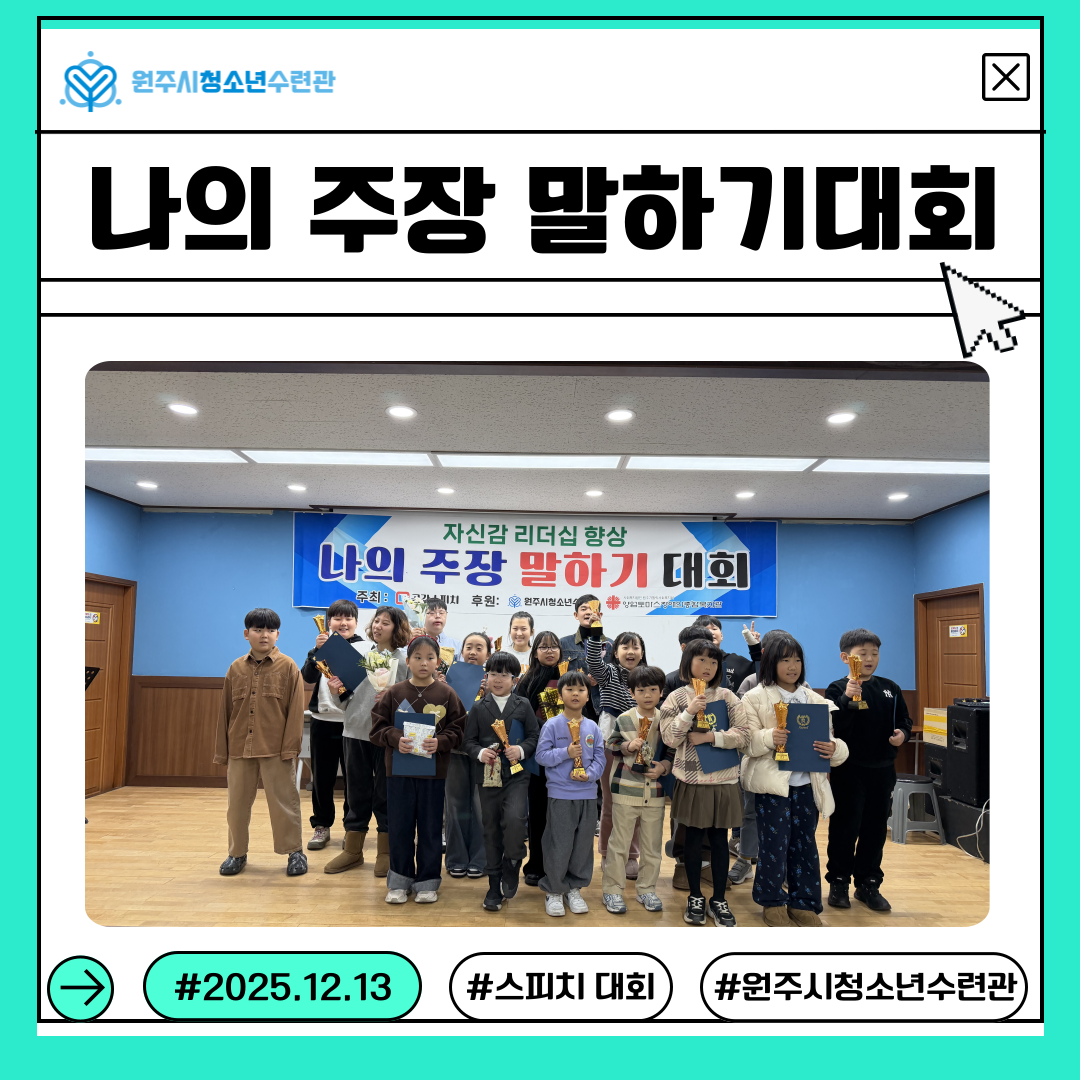 원주시청소년수련관에서는 유스데이 가을학기 프로그램에 참여한 친구들이 '나의 주장 말하기대회' 를 공감스피치 리더십교육원과 함께 진행하였습니다.