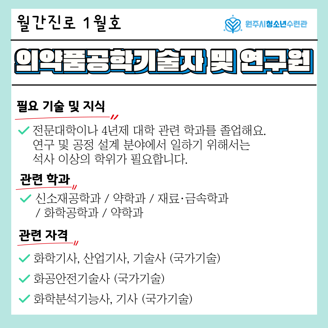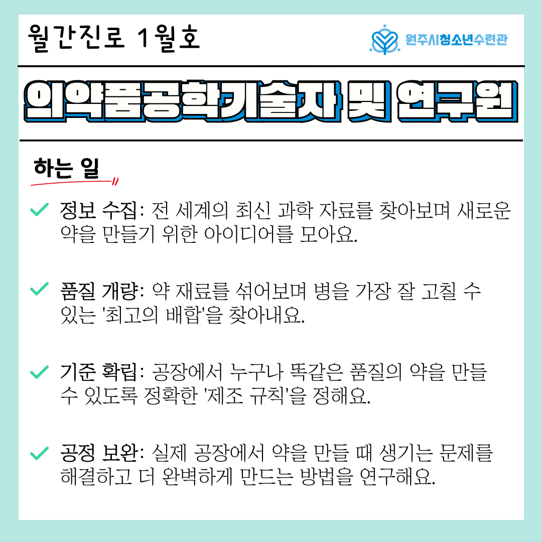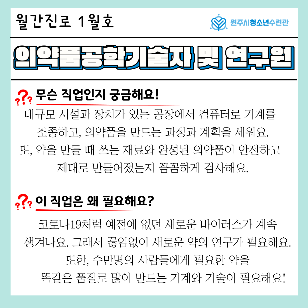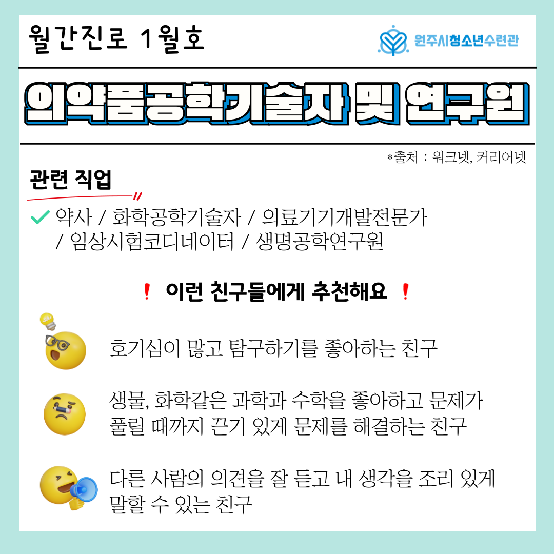 월간진로 1월의 주제는 '의약품공학기술자 및 연구원'입니다 !