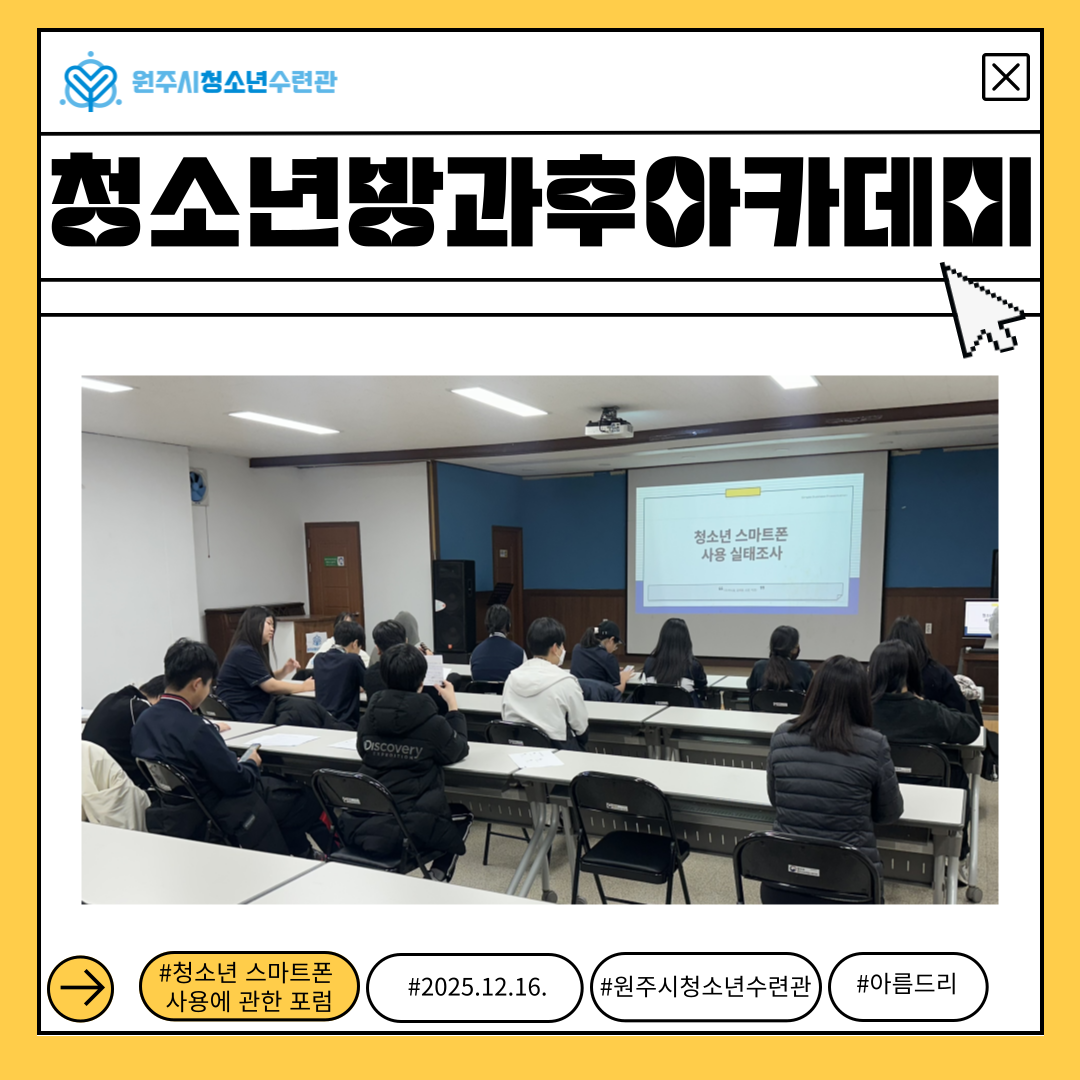 원주시청소년수련관 제8회 포럼은 방과후아카데미 청소년들이 직접 준비한 「청소년 스마트폰 사용에 관한 포럼」으로 진행되었습니다. 청소년들은 4개의 조로 나뉘어 4개의 주제로 자료조사와 발표 준비를 열심히 했습니다👍👍