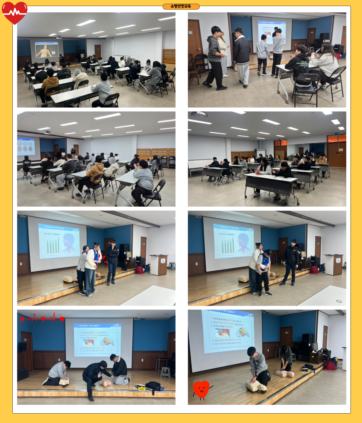 🚑내용: 심정지 판단 방법, 심폐소생술의 절차 및 실습, 하임리히법 이론 및 실습 등