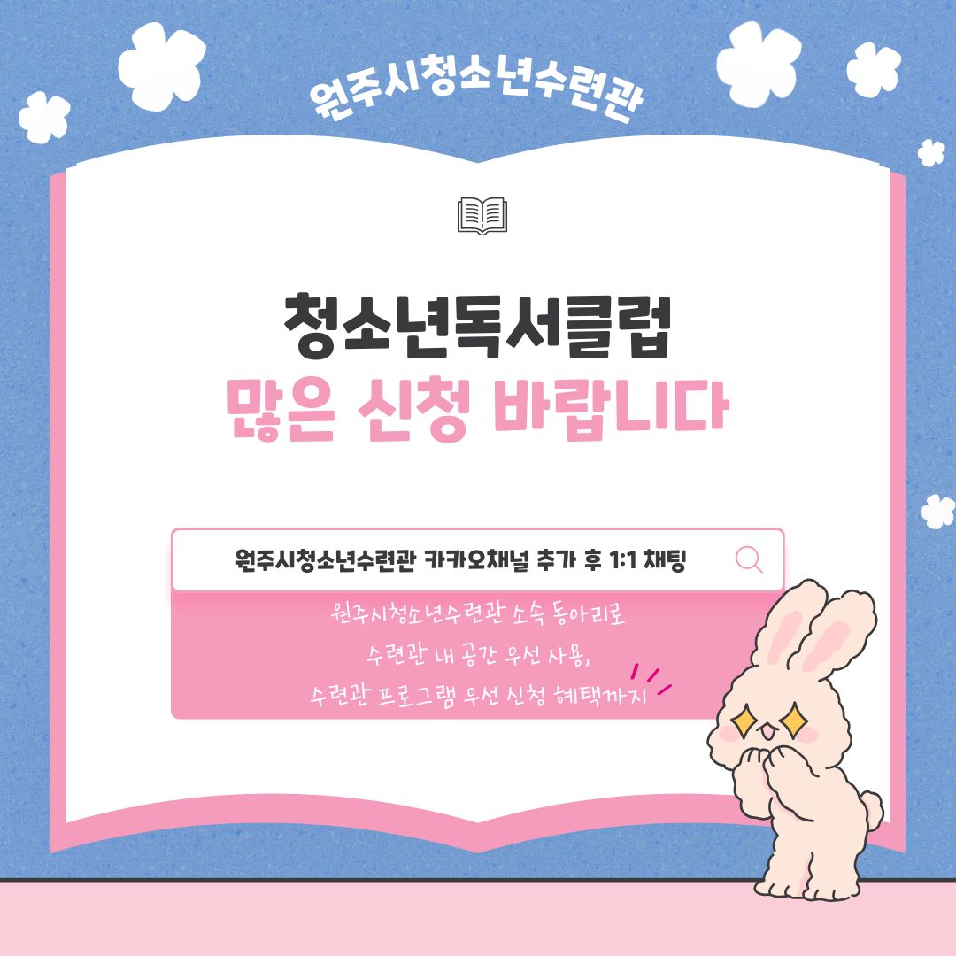 원주시청소년수련관 소속 청소년독서클럽📚 조용하지만 소란스러운 당신의 취향을 함께 나눠요🤗🤗🤗 - 모집대상 : 중고등학생 - 모집인원 : 10명 이내 - 활동장소 : 원주시청소년수련관 내