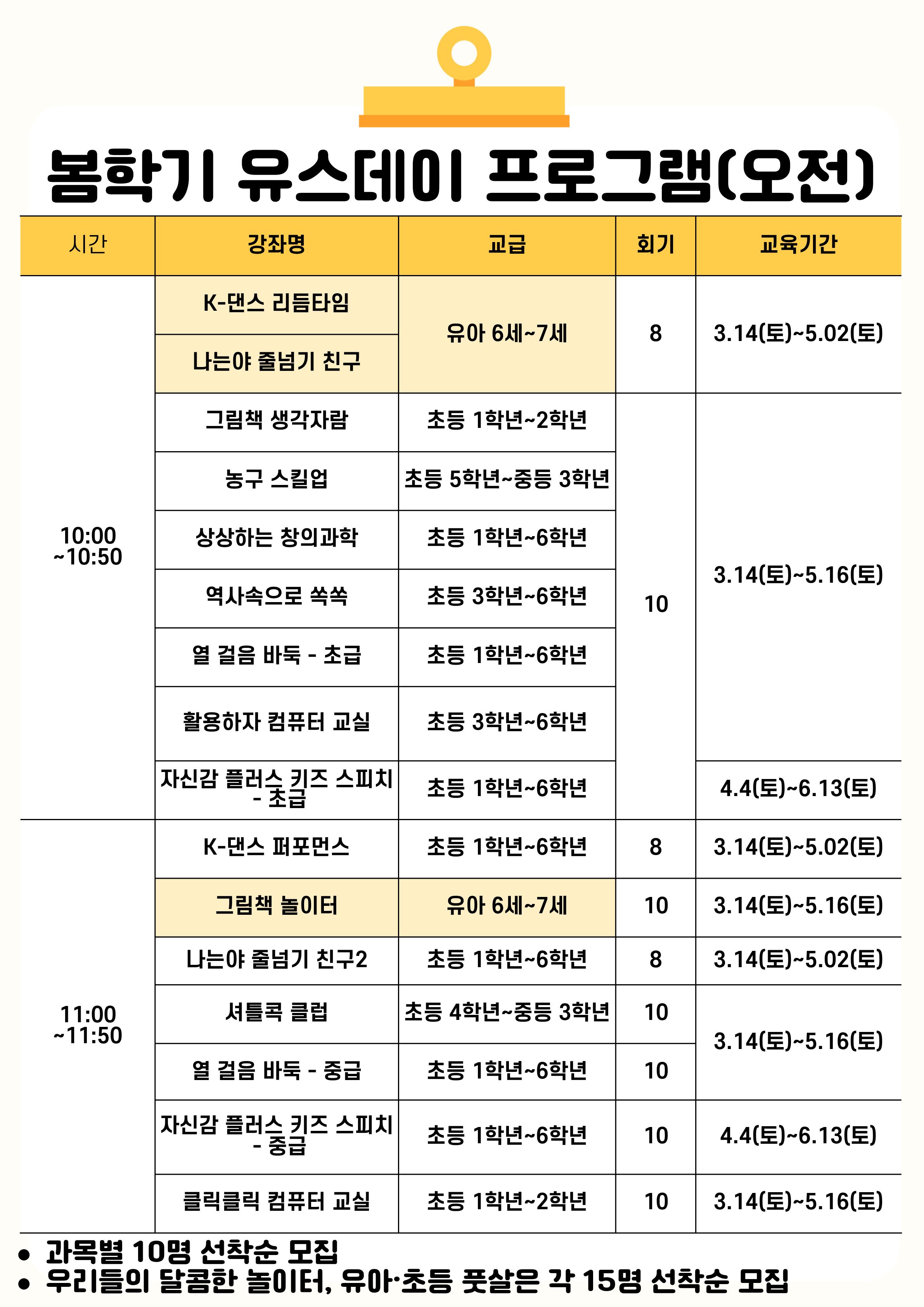 <봄학기 유스데이 프로그램 전체 시간표>