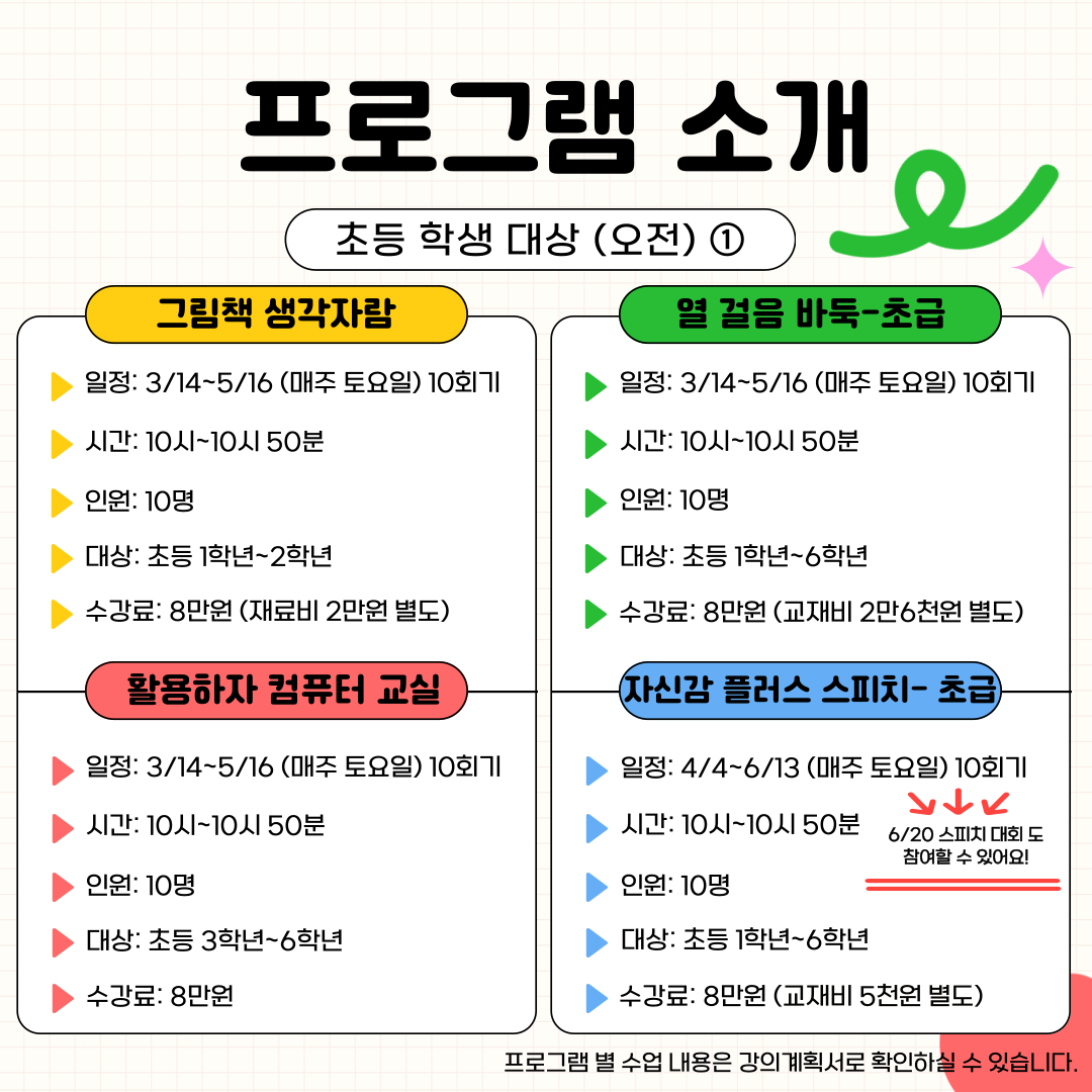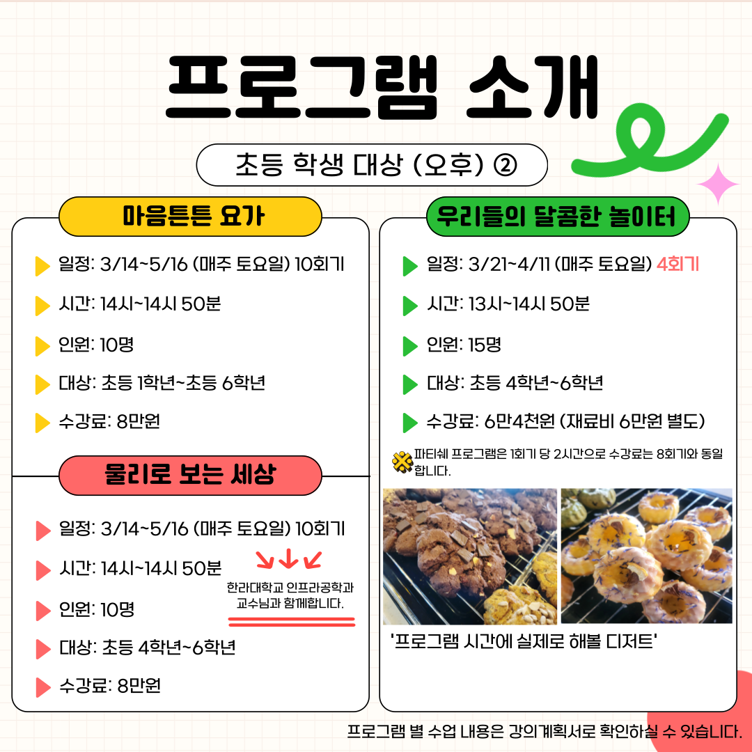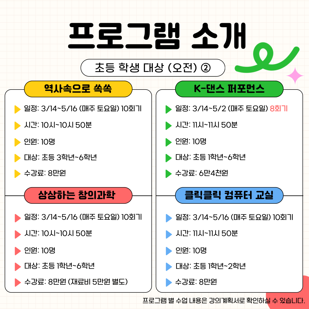 프로그램에 관심과 참여에 감사드립니다. 아래 일정을 참고하시어 신청바랍니다.😀 - 강의계획서는 수련관 홈페이지에 게시되어 있습니다. ❤️ 홈페이지로 이동하기 ❤️ 🌸 모집 기간 : 2026