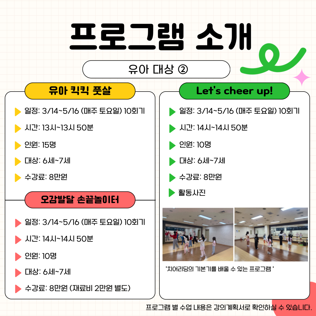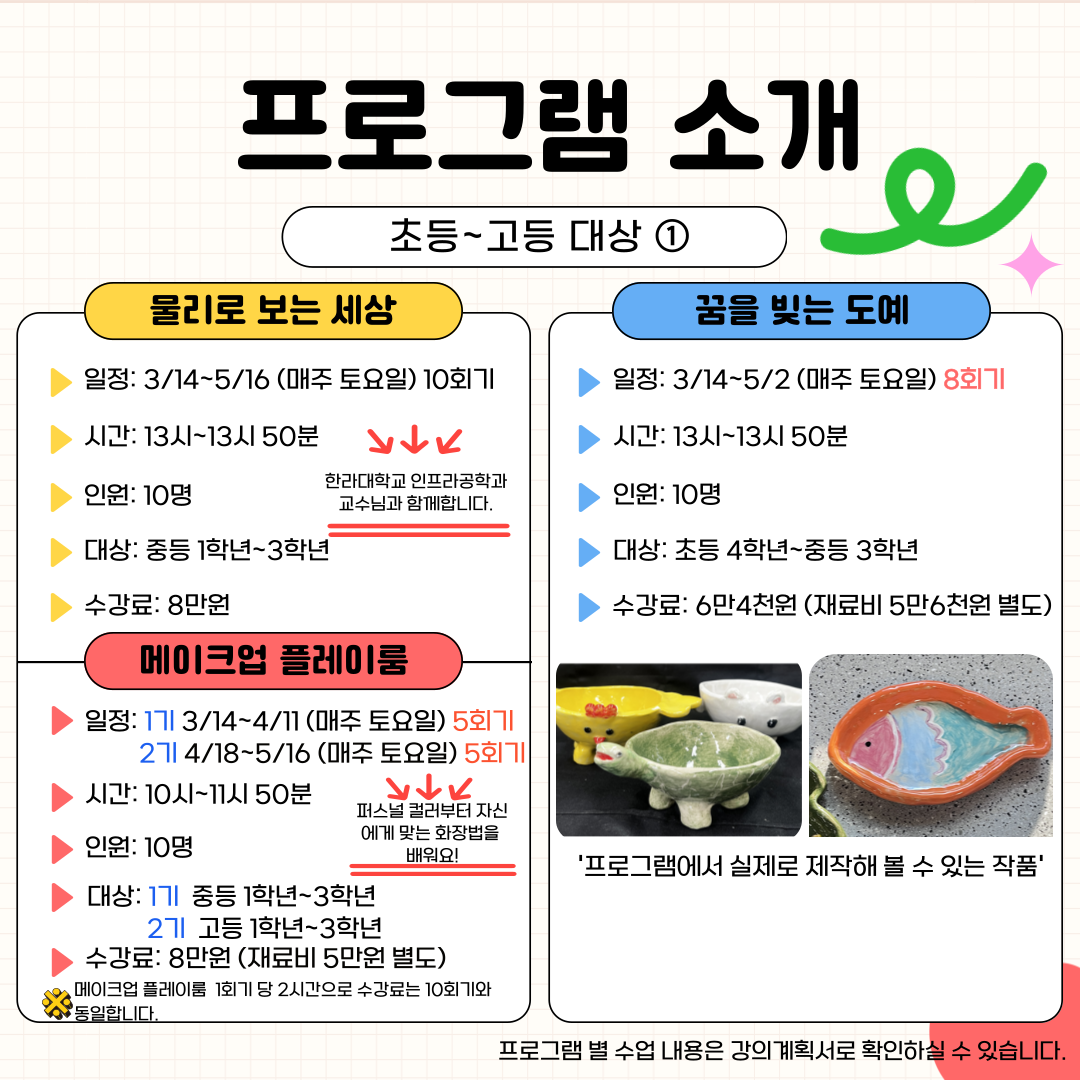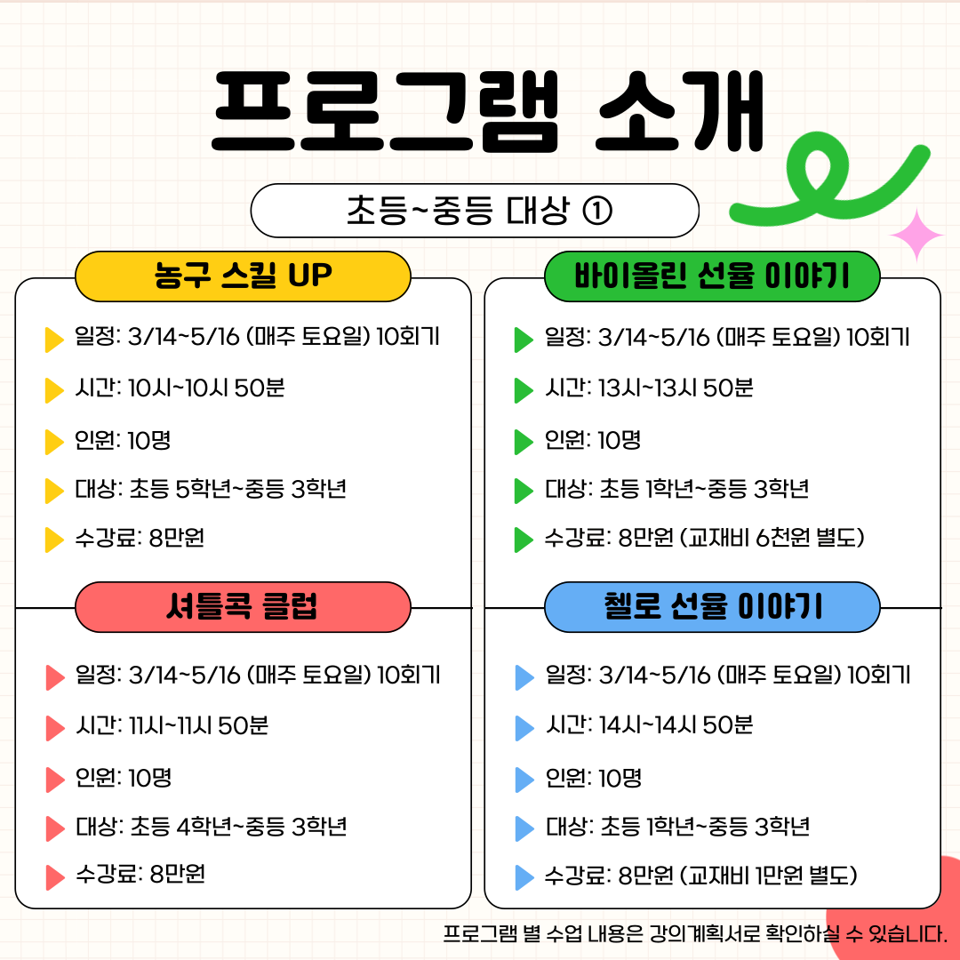 프로그램에 관심과 참여에 감사드립니다. 아래 일정을 참고하시어 신청바랍니다.😀 - 강의계획서는 수련관 홈페이지에 게시되어 있습니다. ❤️ 홈페이지로 이동하기 ❤️ 🌸 모집 기간 : 2026