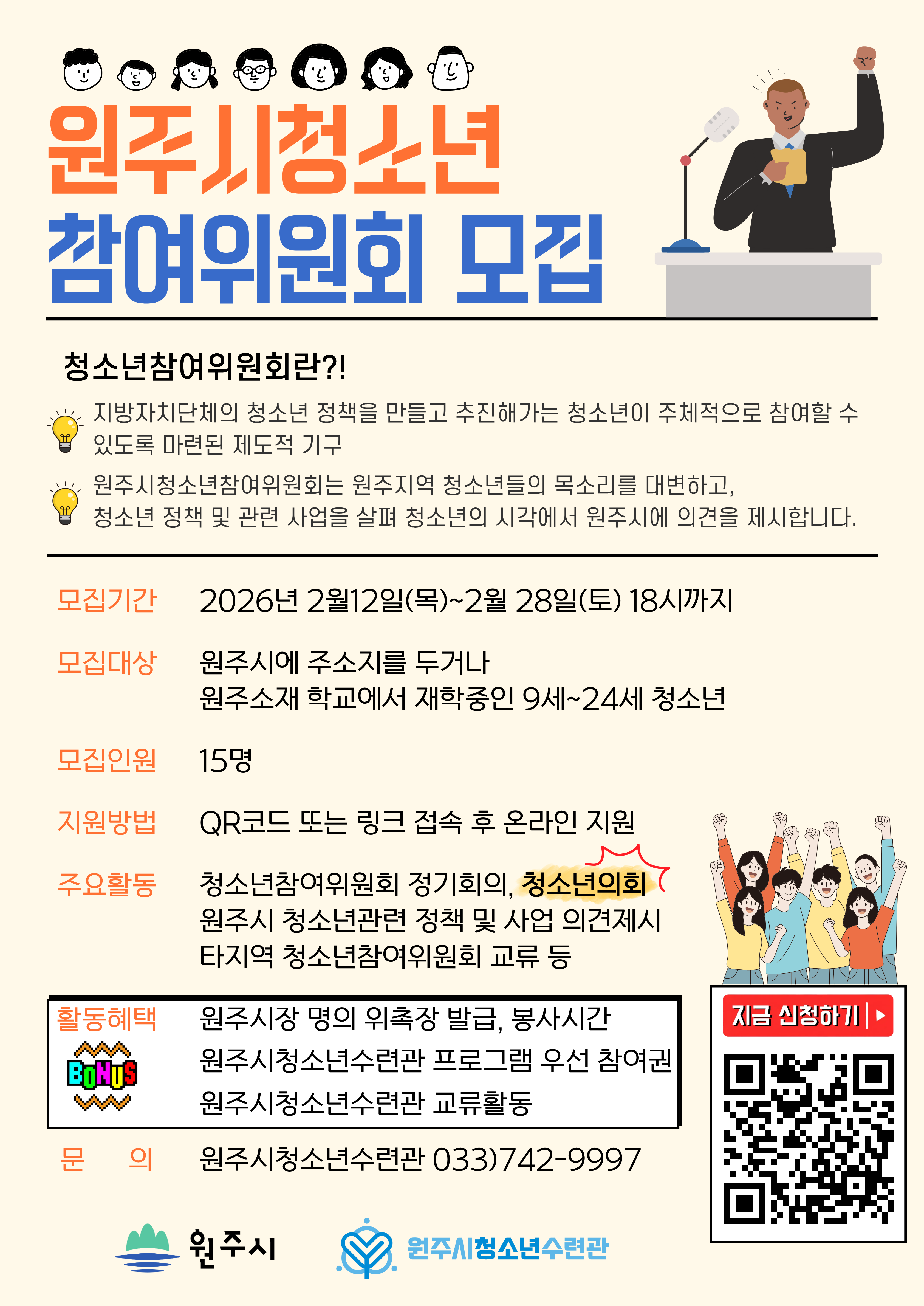 2026년 원주시청소년참여위원회 신규위원을 모집합니다.