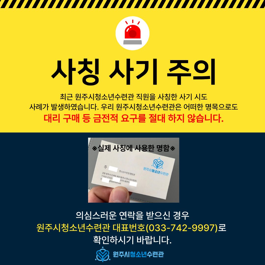 최근 원주시청소년수련관 직원을 사칭한 사기 시도 사례가 발생하였습니다.