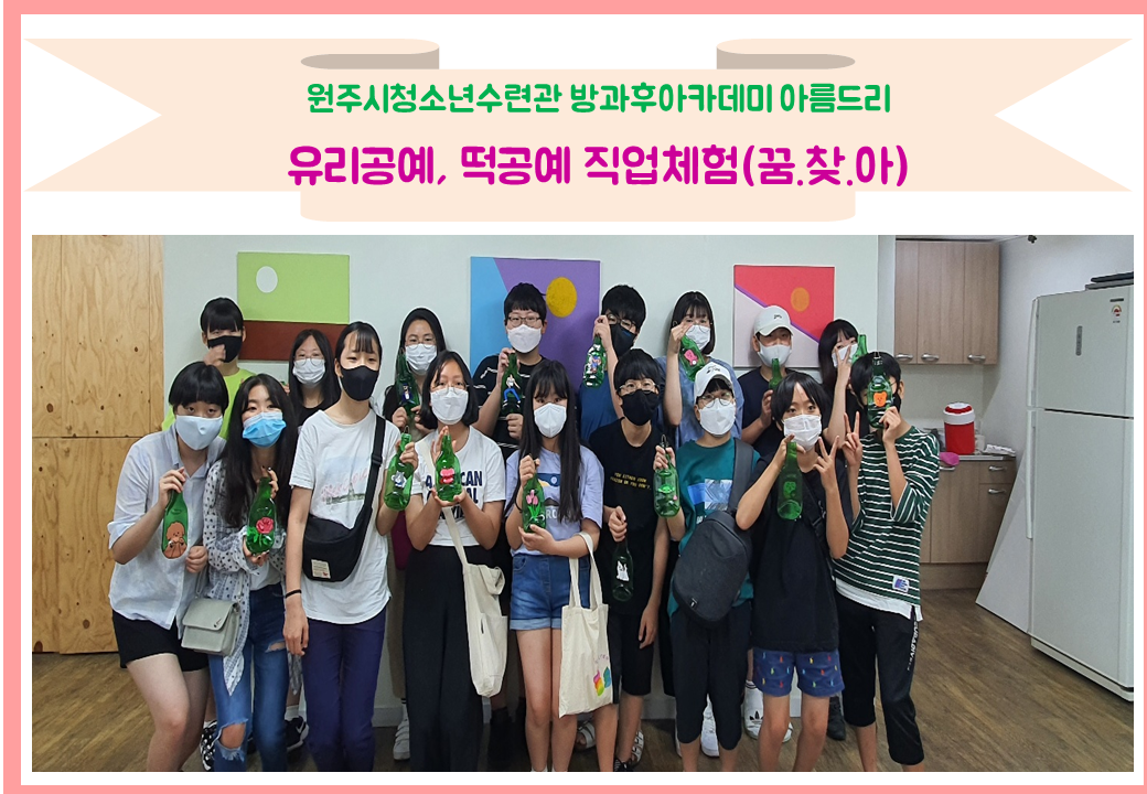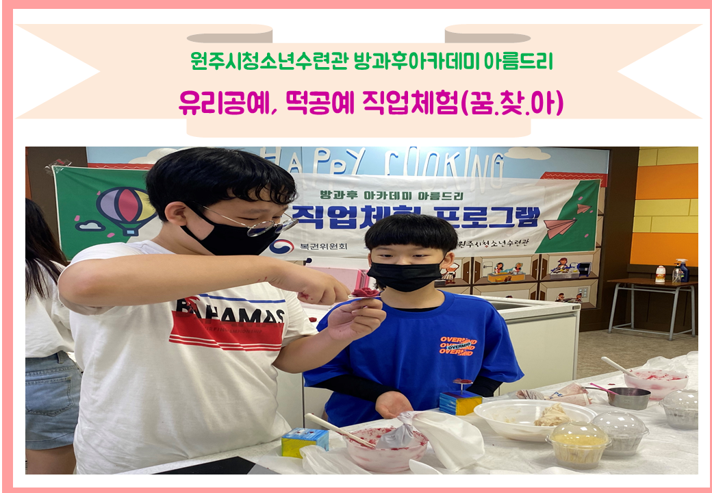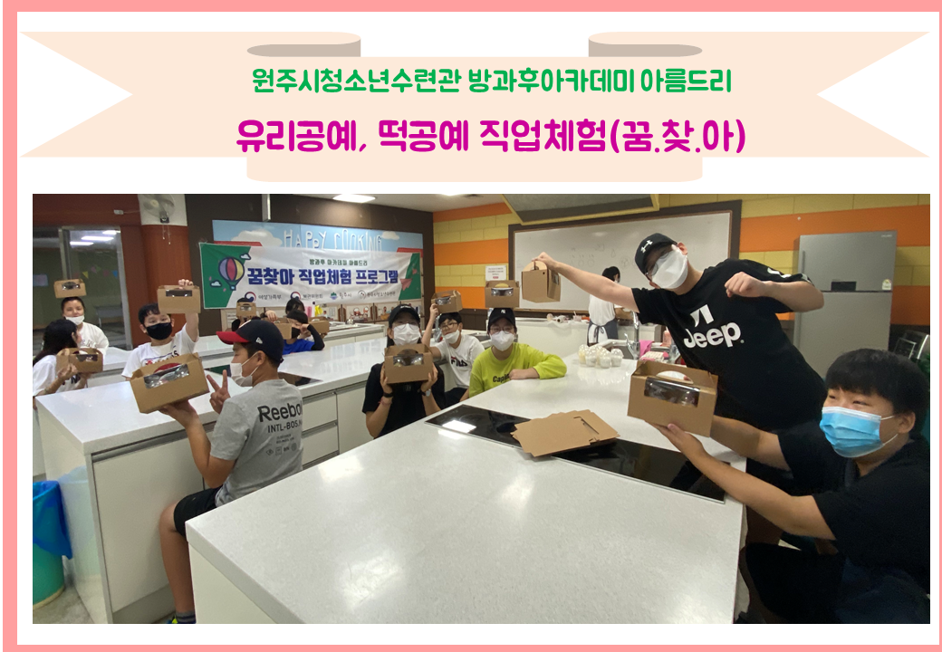 아름드리 청소년들은 꿈찾아 프로그램 연계 활동으로 2가지로 나뉘어 업사이클 유리공예와 앙금 설기떡 공예 직업체험을 진행하였습니다. 아름드리 청소년들이 진로탐색과 직업선택에 도움이 되는 시간이었습니다.