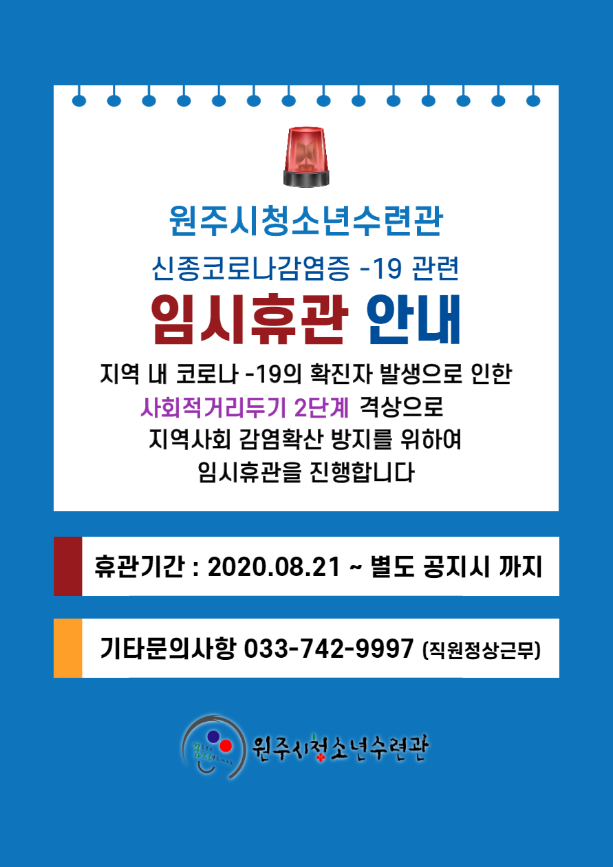 지역내 코로나-19 확진자 발생으로 인한 지역사회감염확산 방지를 위하여 임시휴관 안내드립니다.