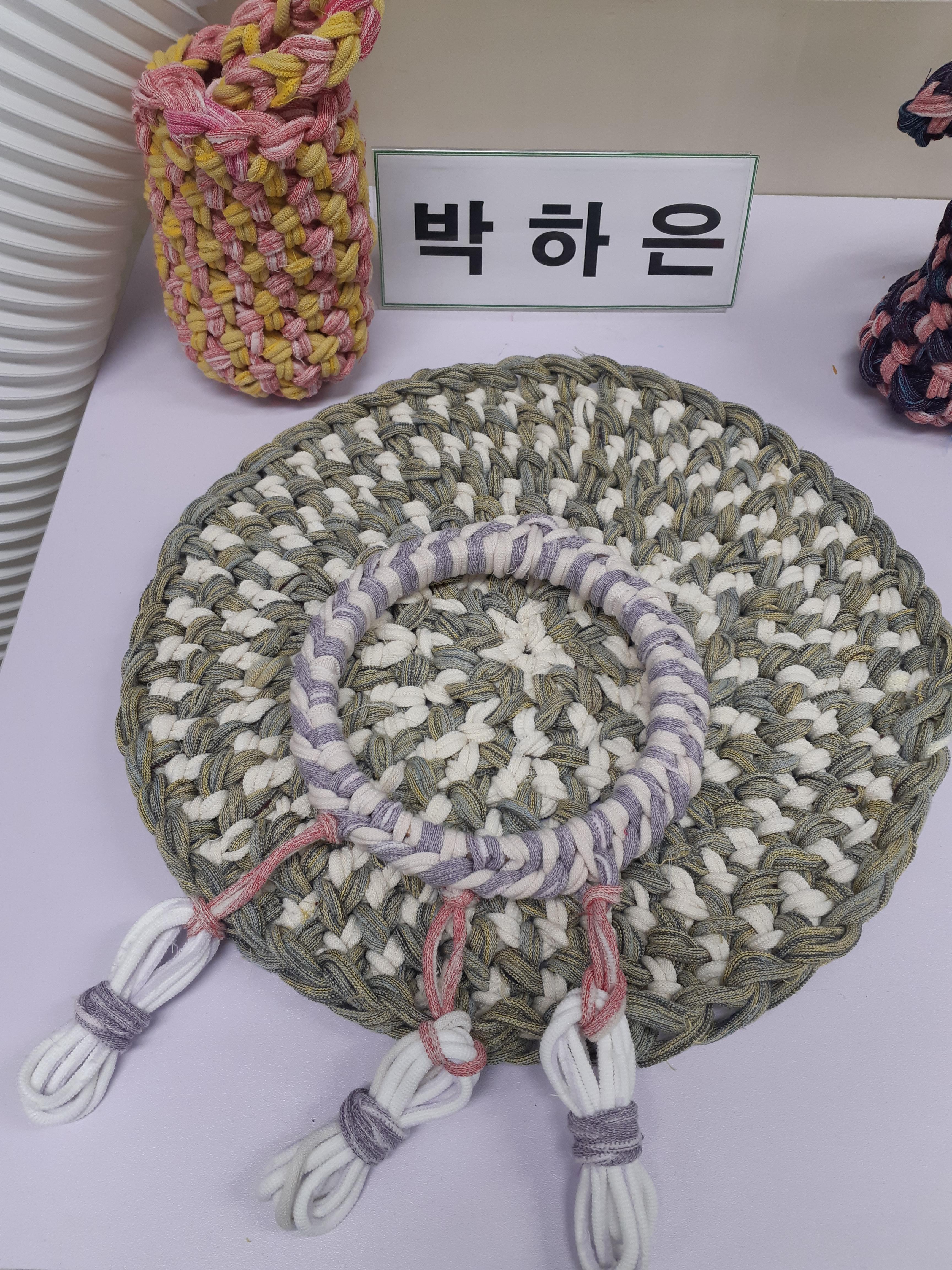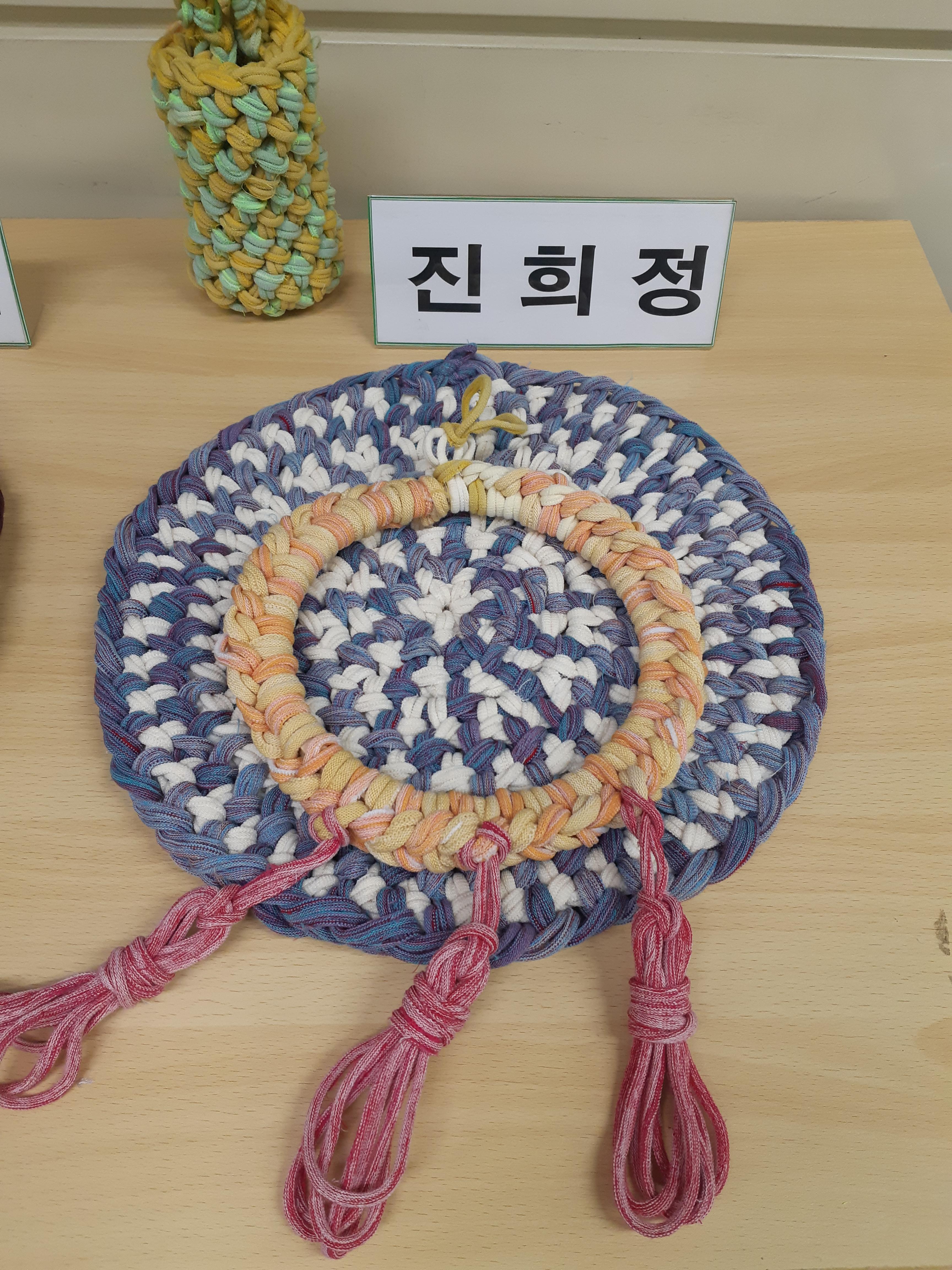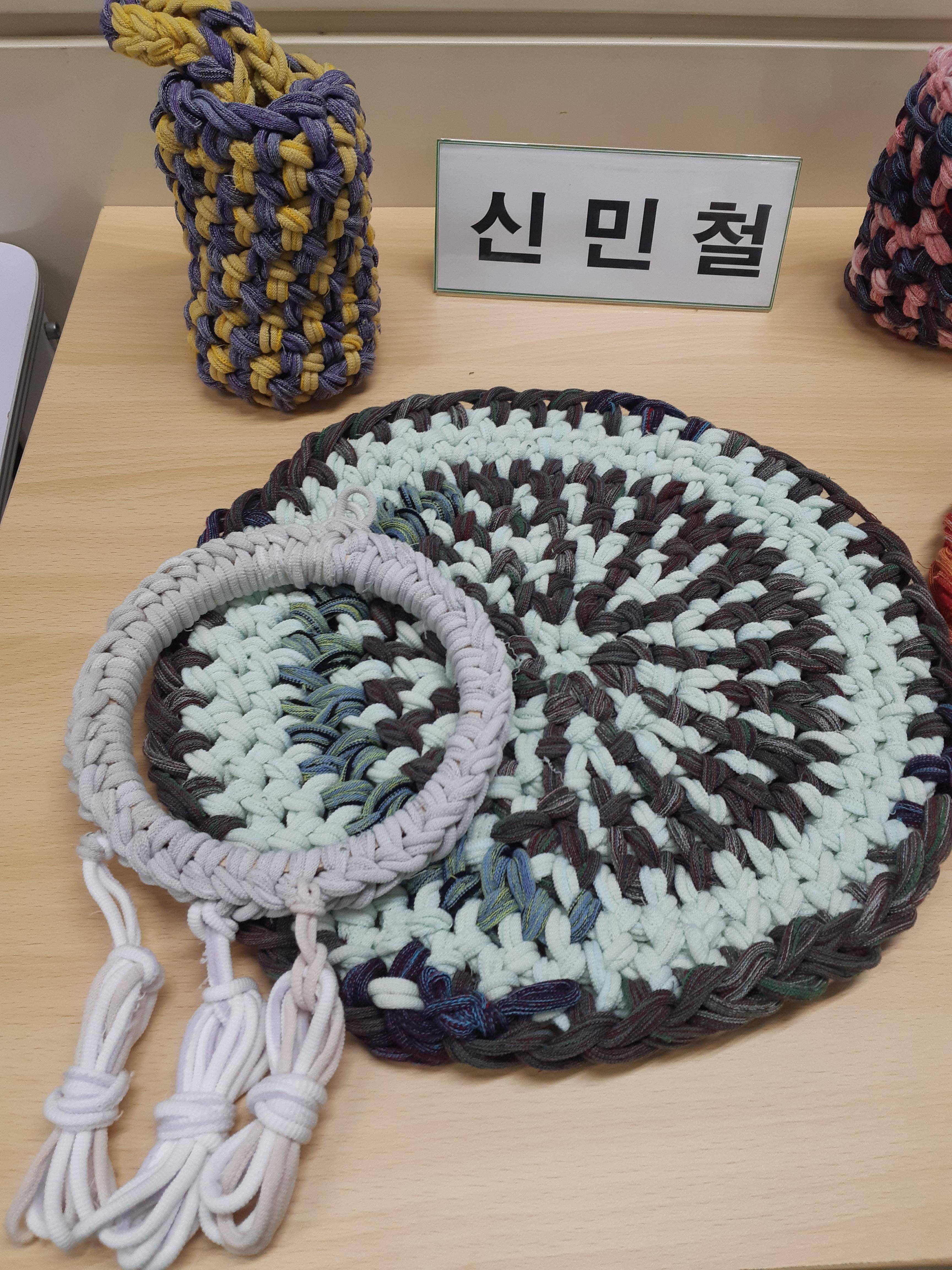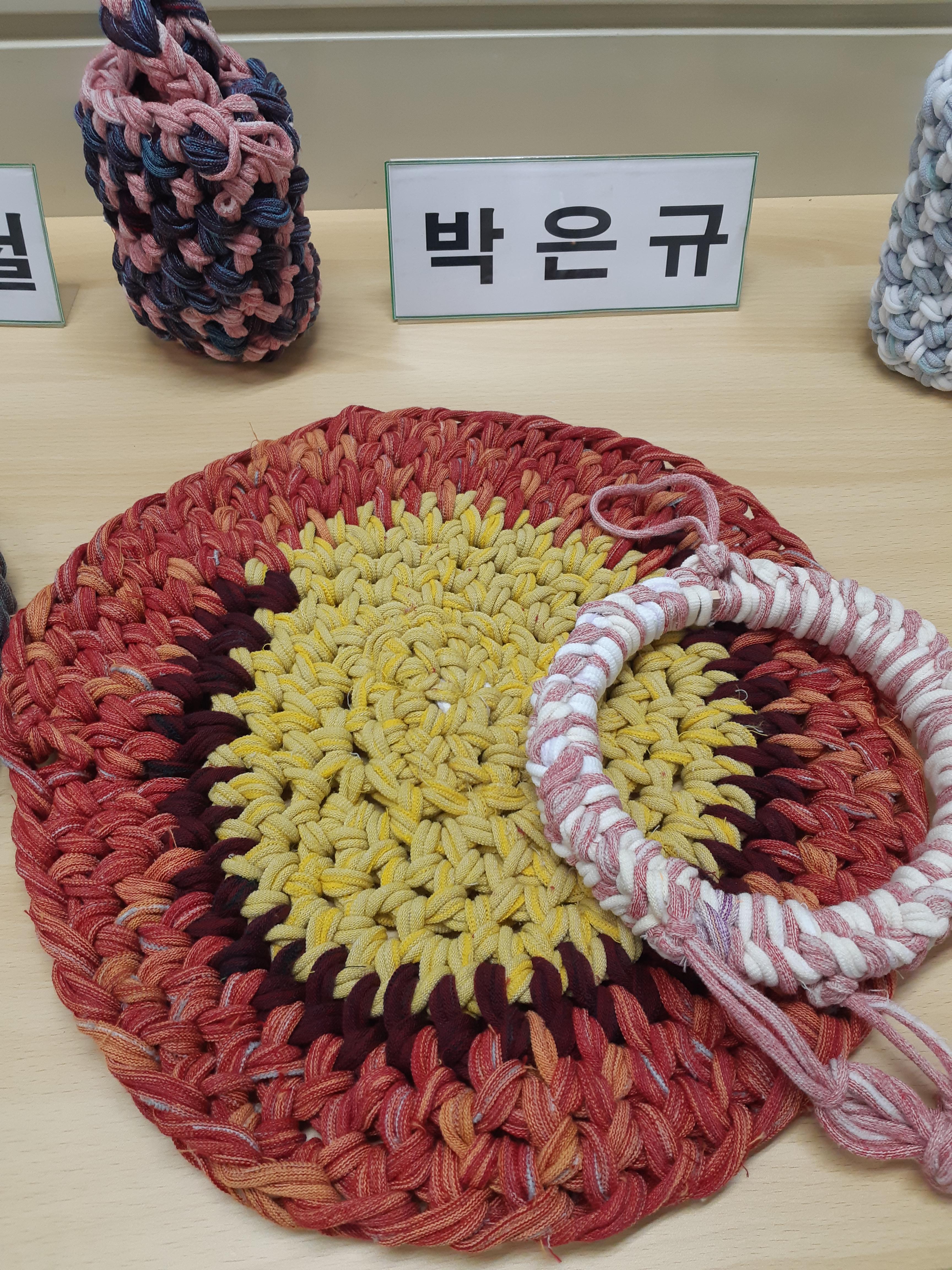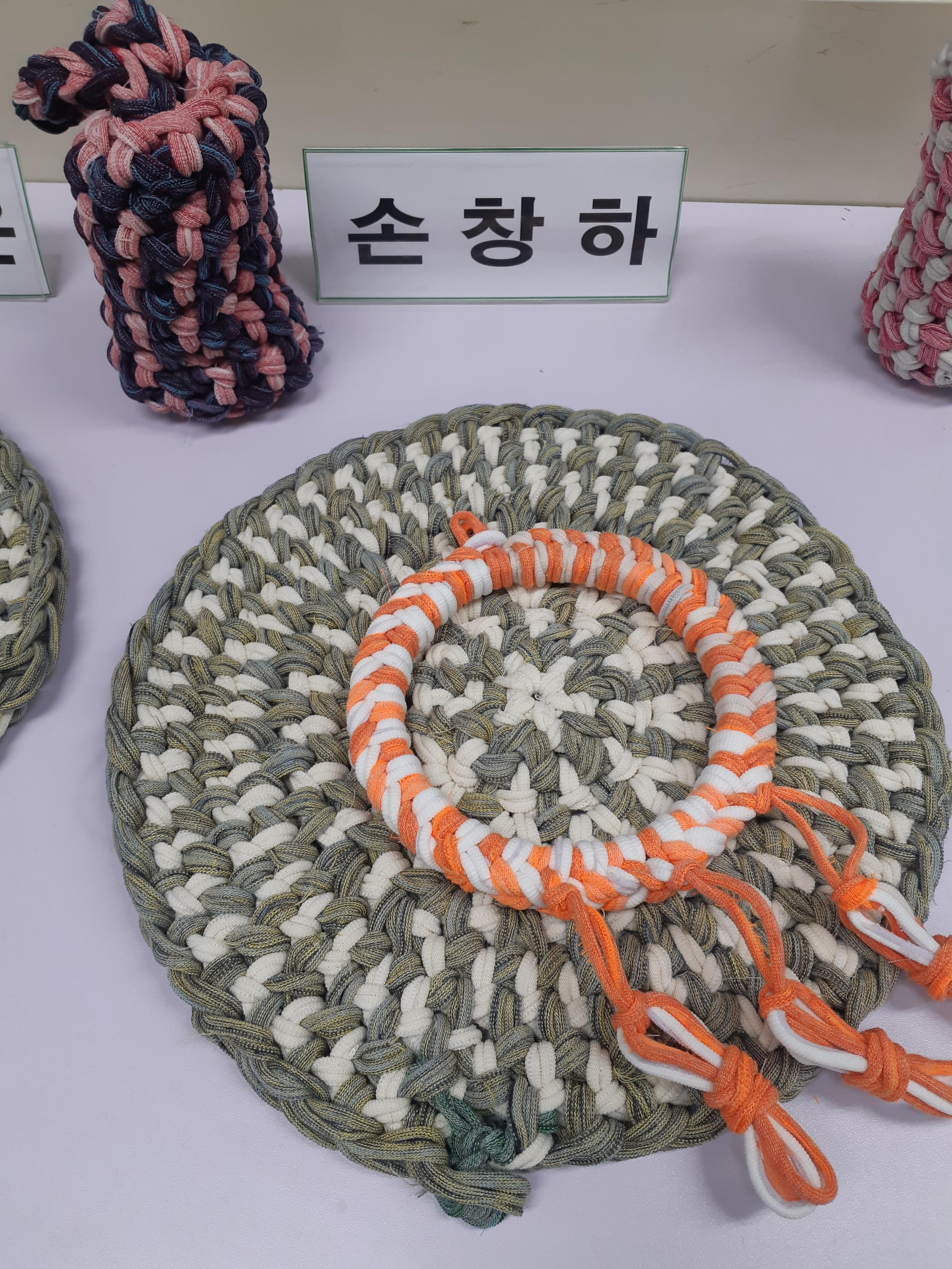 2팀으로 진행된 협업작품은 한 팀은 사각매트 뜨기를 활용해서 큰 러그를 만들었고