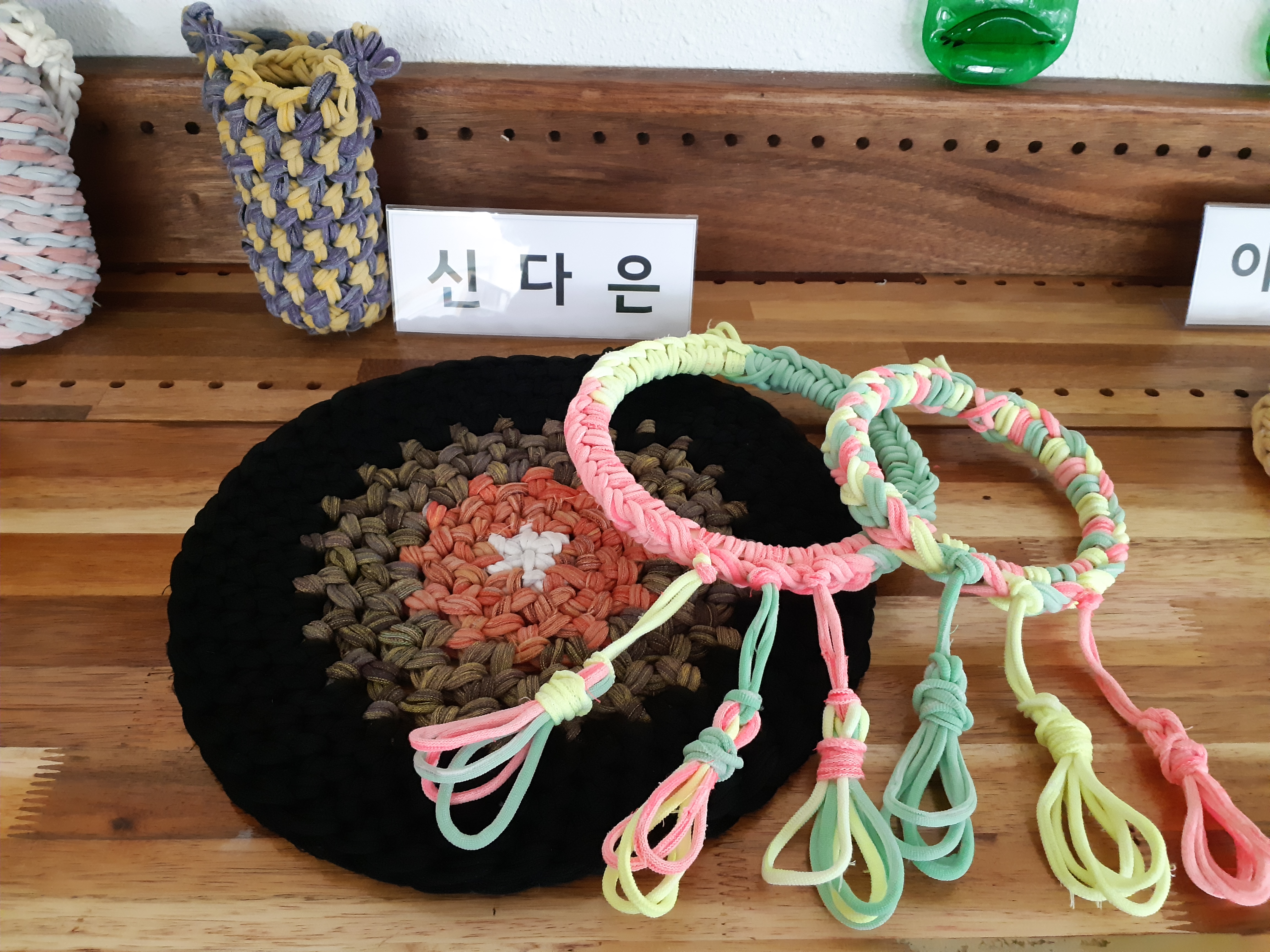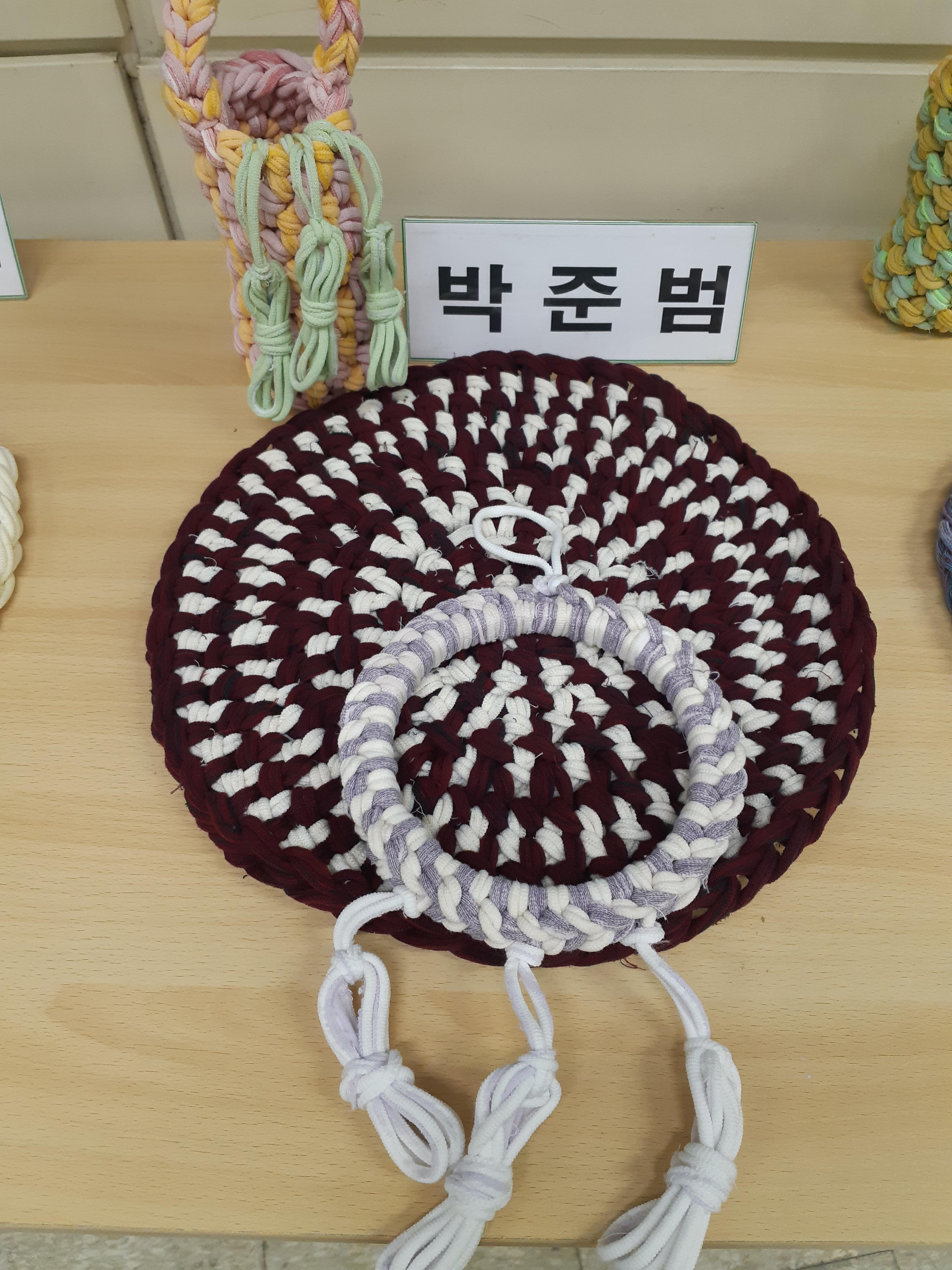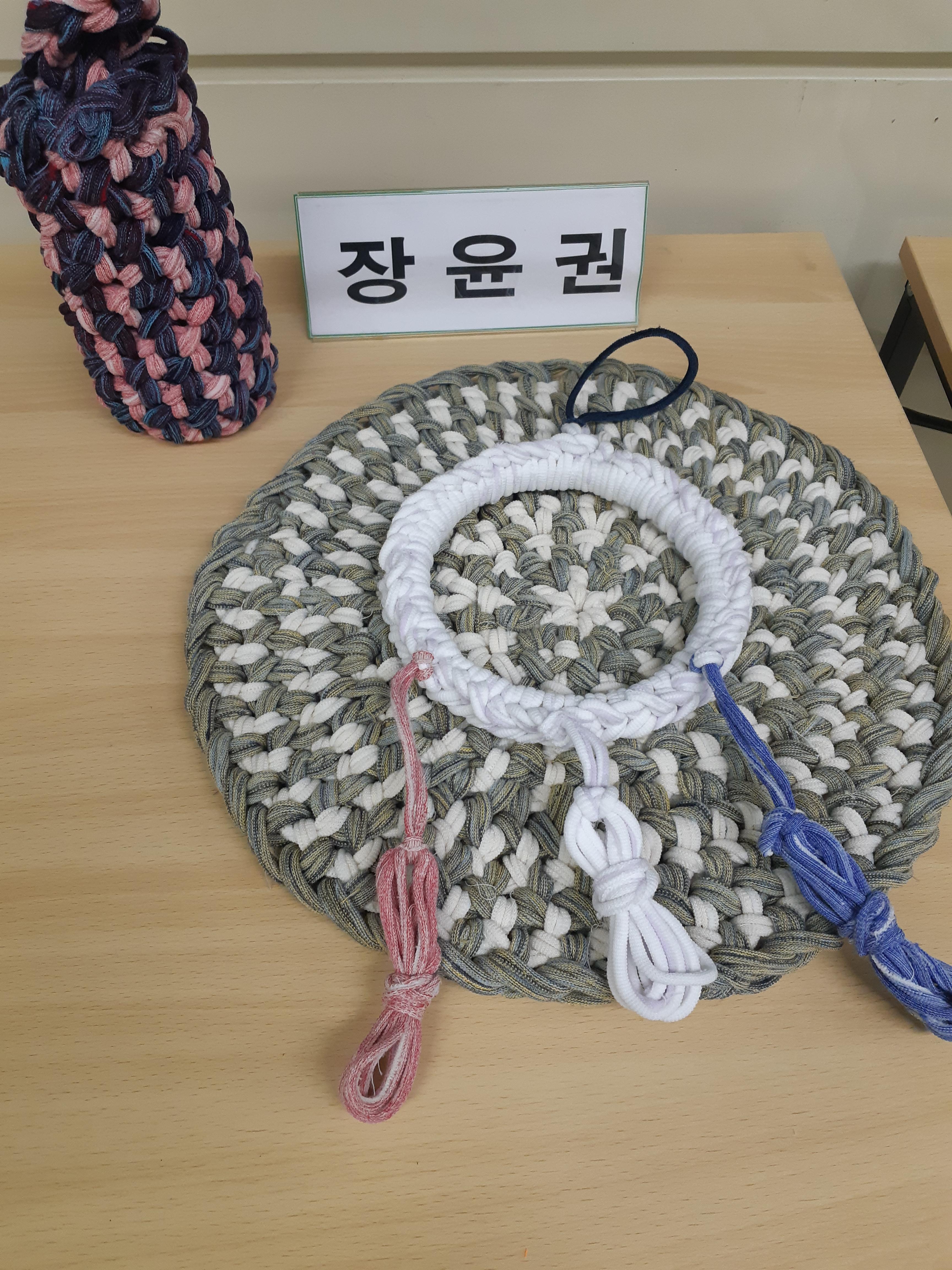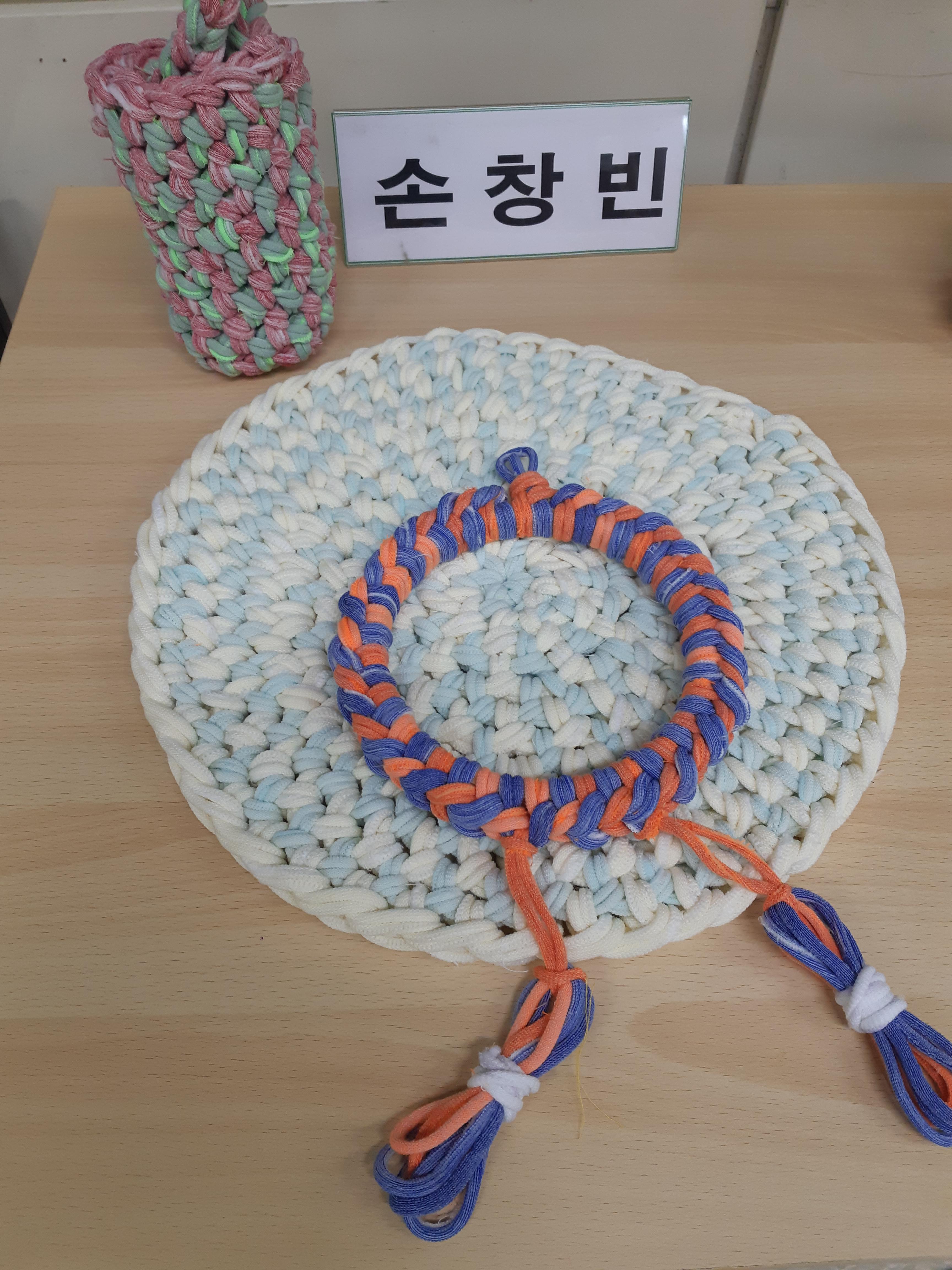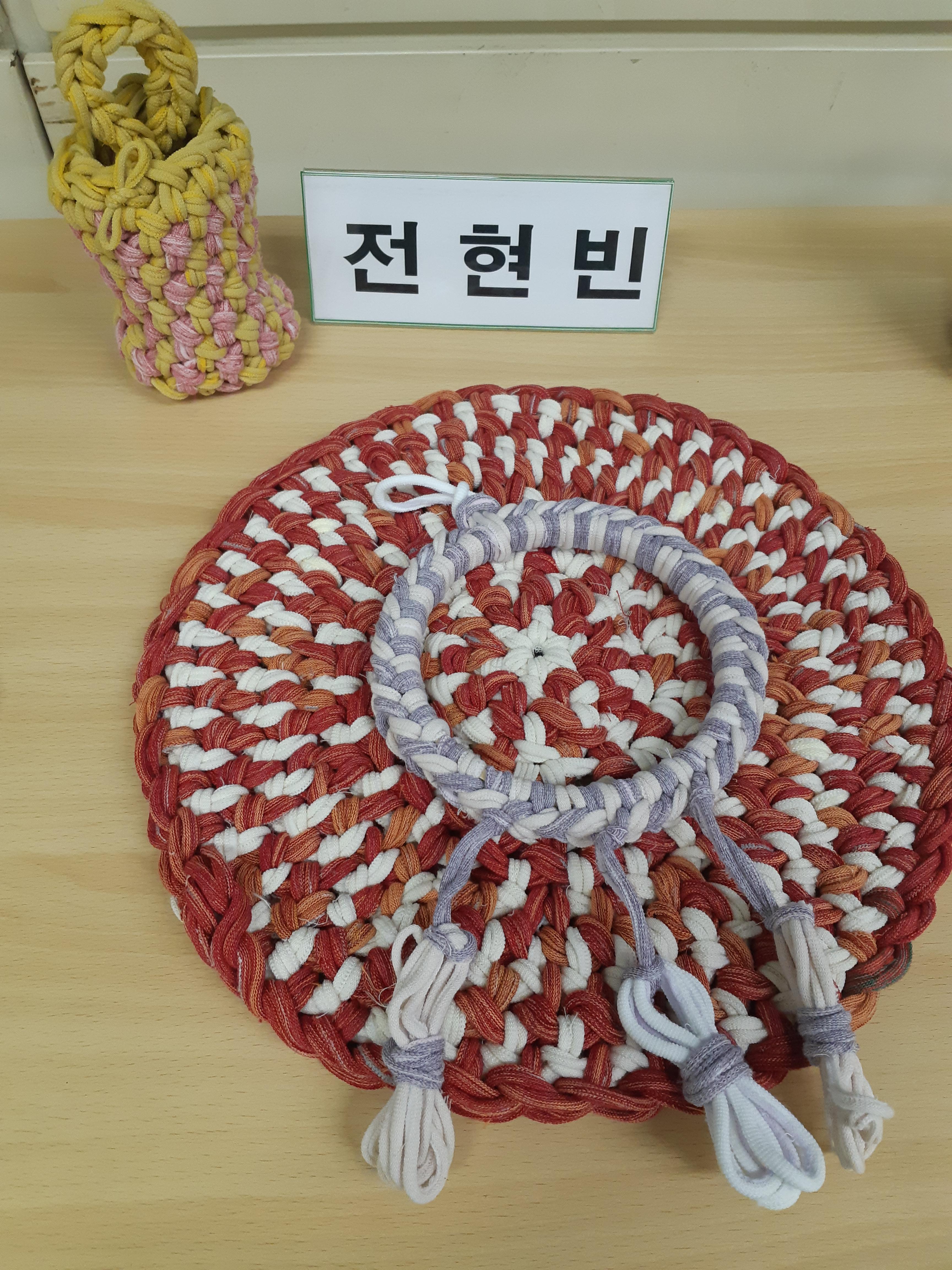 2팀으로 진행된 협업작품은 한 팀은 사각매트 뜨기를 활용해서 큰 러그를 만들었고