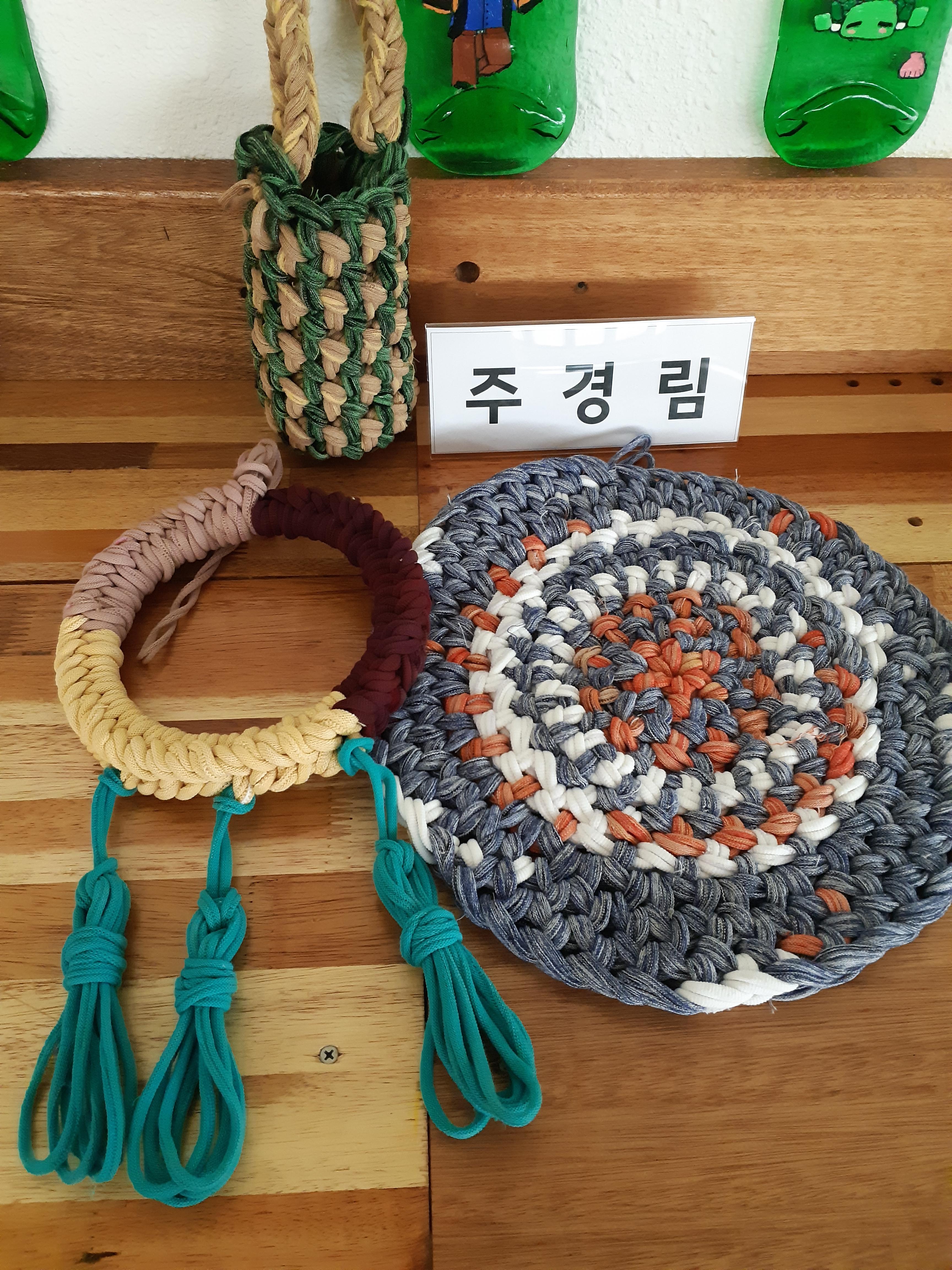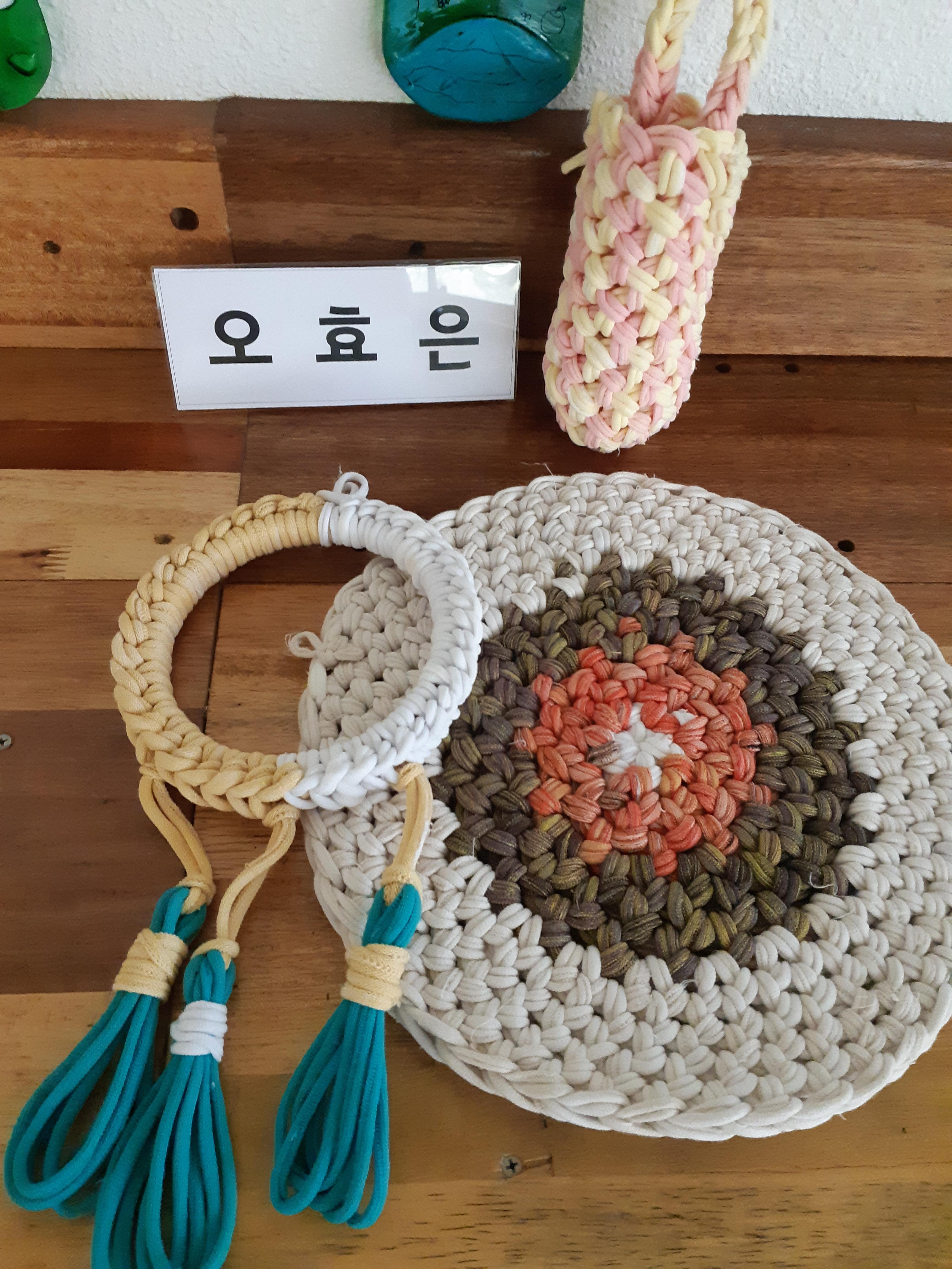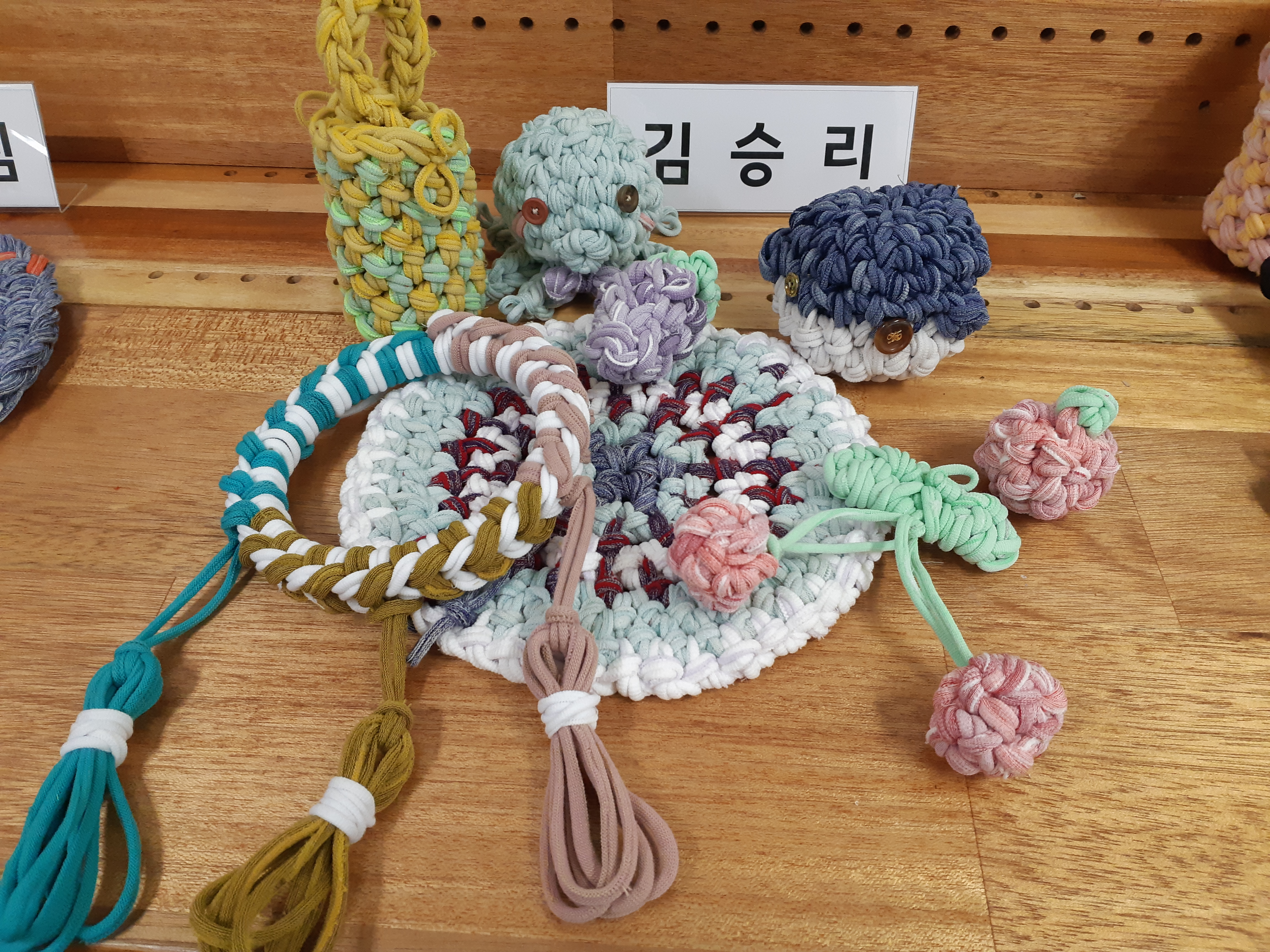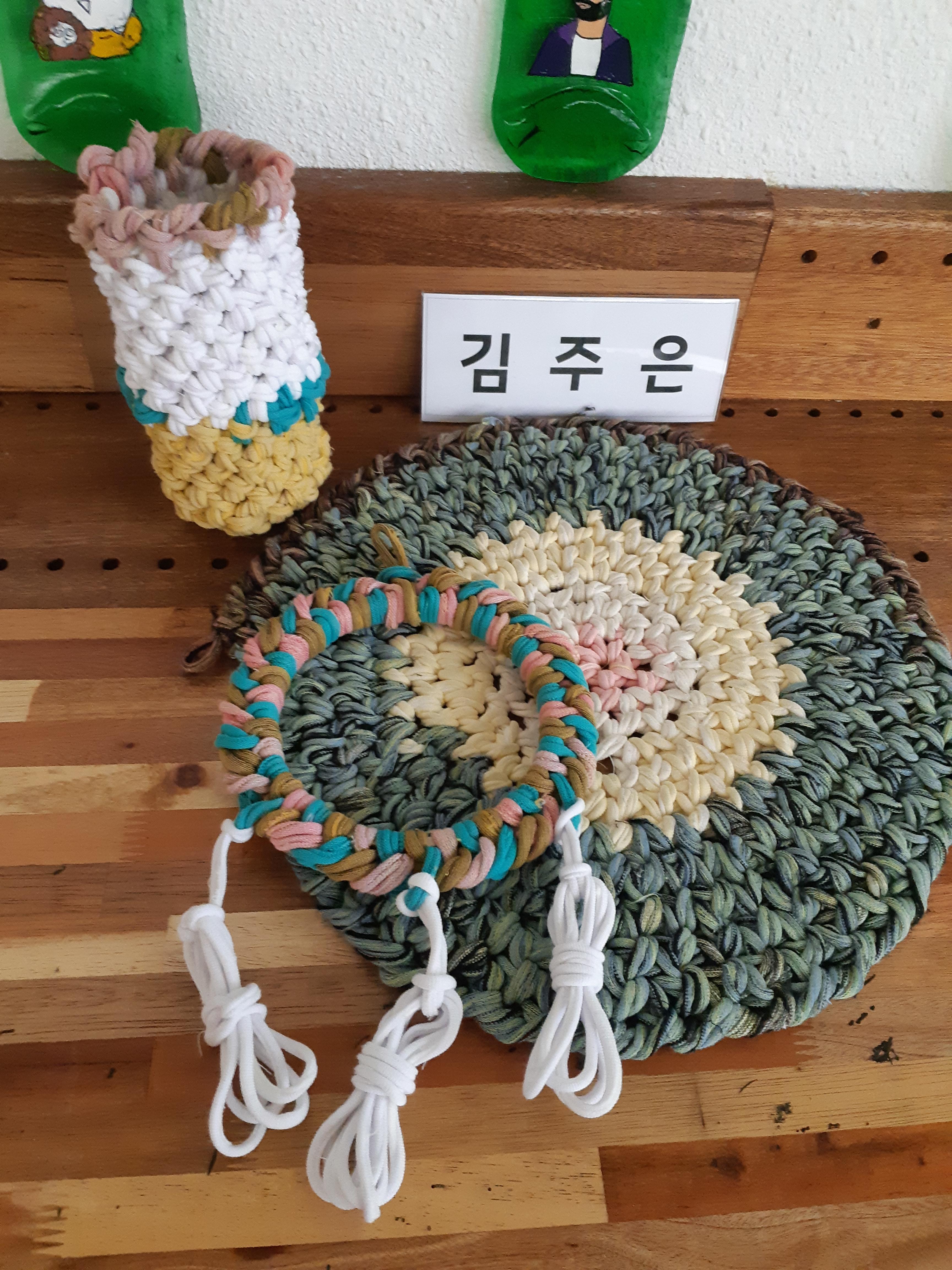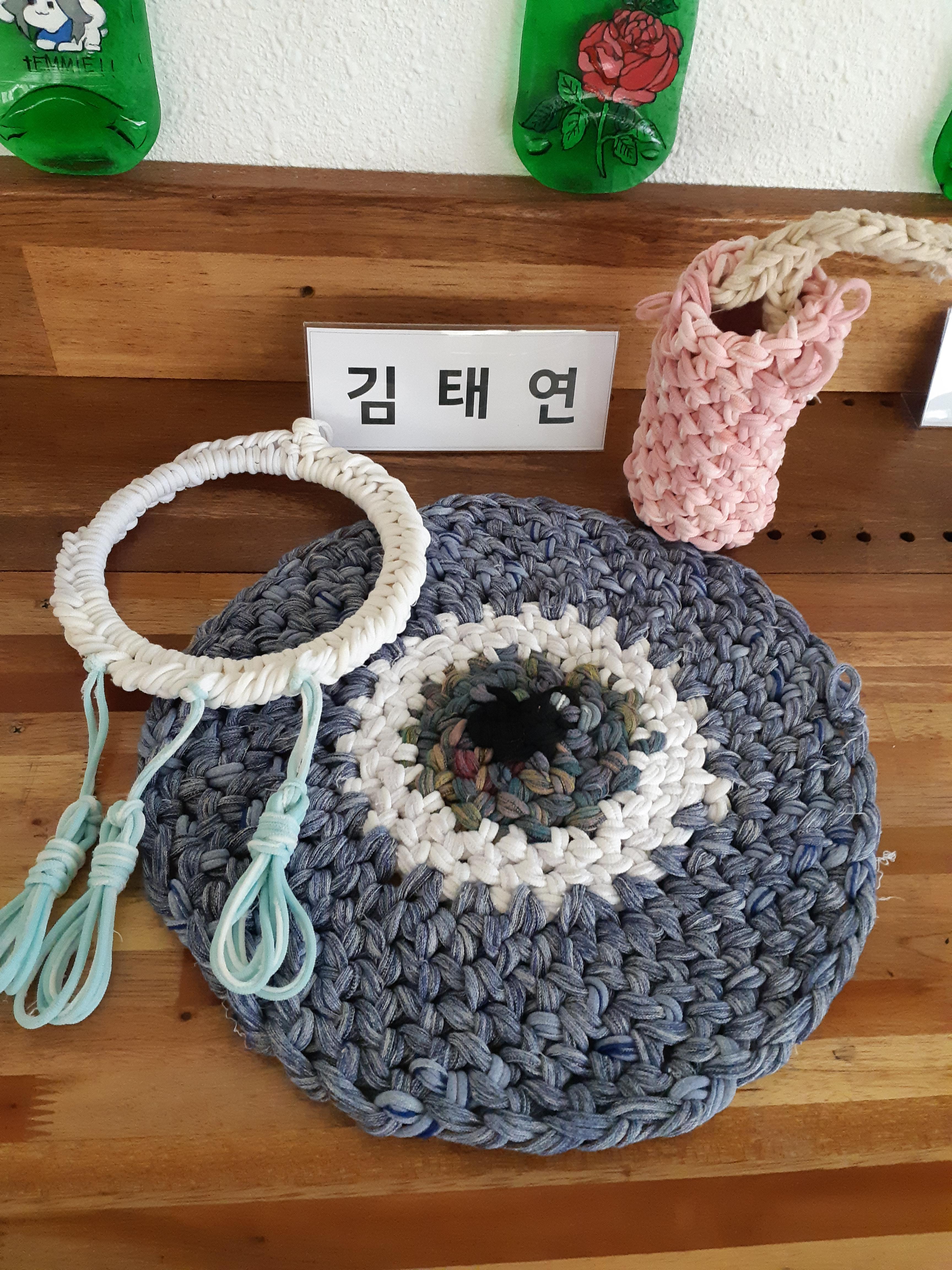 2팀으로 진행된 협업작품은 한 팀은 사각매트 뜨기를 활용해서 큰 러그를 만들었고