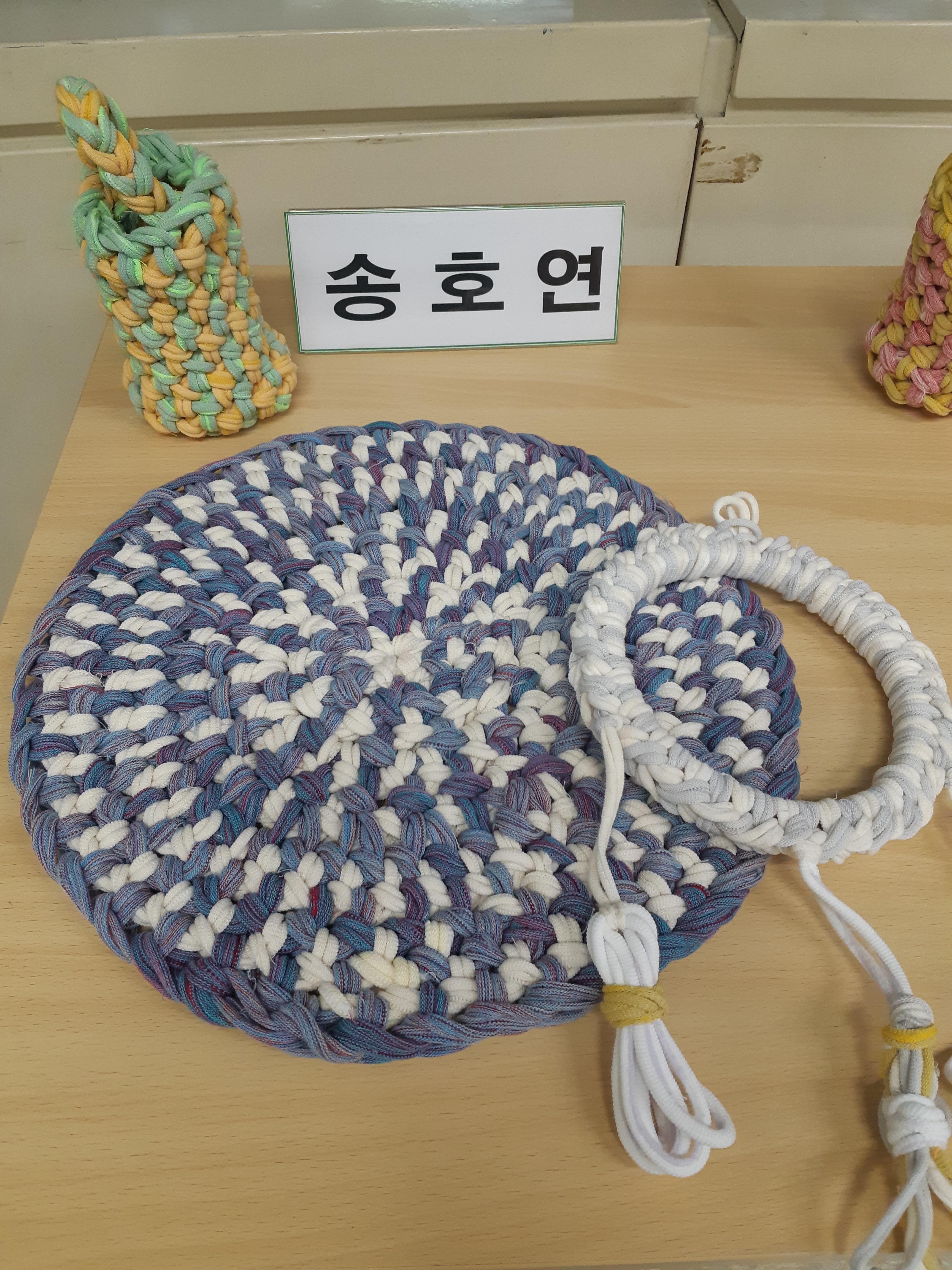 2팀으로 진행된 협업작품은 한 팀은 사각매트 뜨기를 활용해서 큰 러그를 만들었고