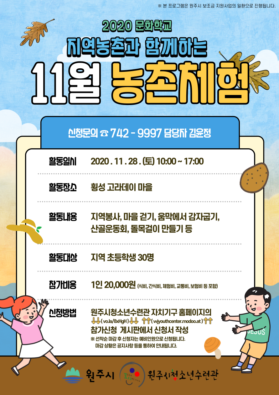 신청 링크는 아래와 같습니다. 신청시 필히 프로그램명에 11월 농촌체험임을 적어주세요!