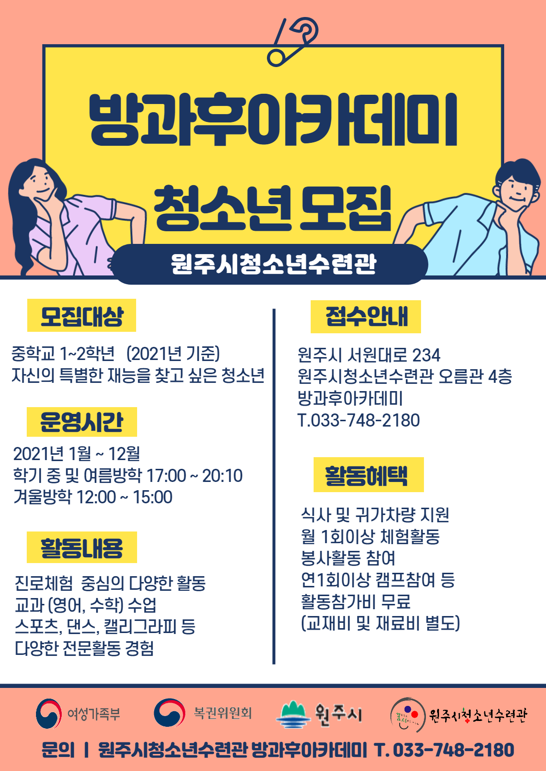 원주시청소년수련관 방과후아카데미 2021년 신입생 모집