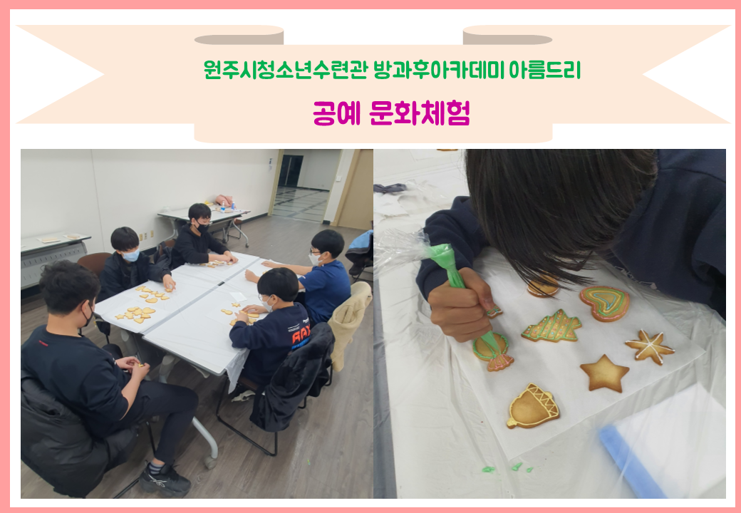 아름드리청소년들은 원주시청소년수련관 내에서 공예 문화체험으로 레진아트, 캘리그라피로 2021년 달력만들기, 아이싱쿠키 만들기 프로그램을 진행하였습니다. 코로나 19로 인해 체험활동의 기회가 줄어든 청소년들에게 문화체험을 통하여 즐거운 시간이 되었습니다.