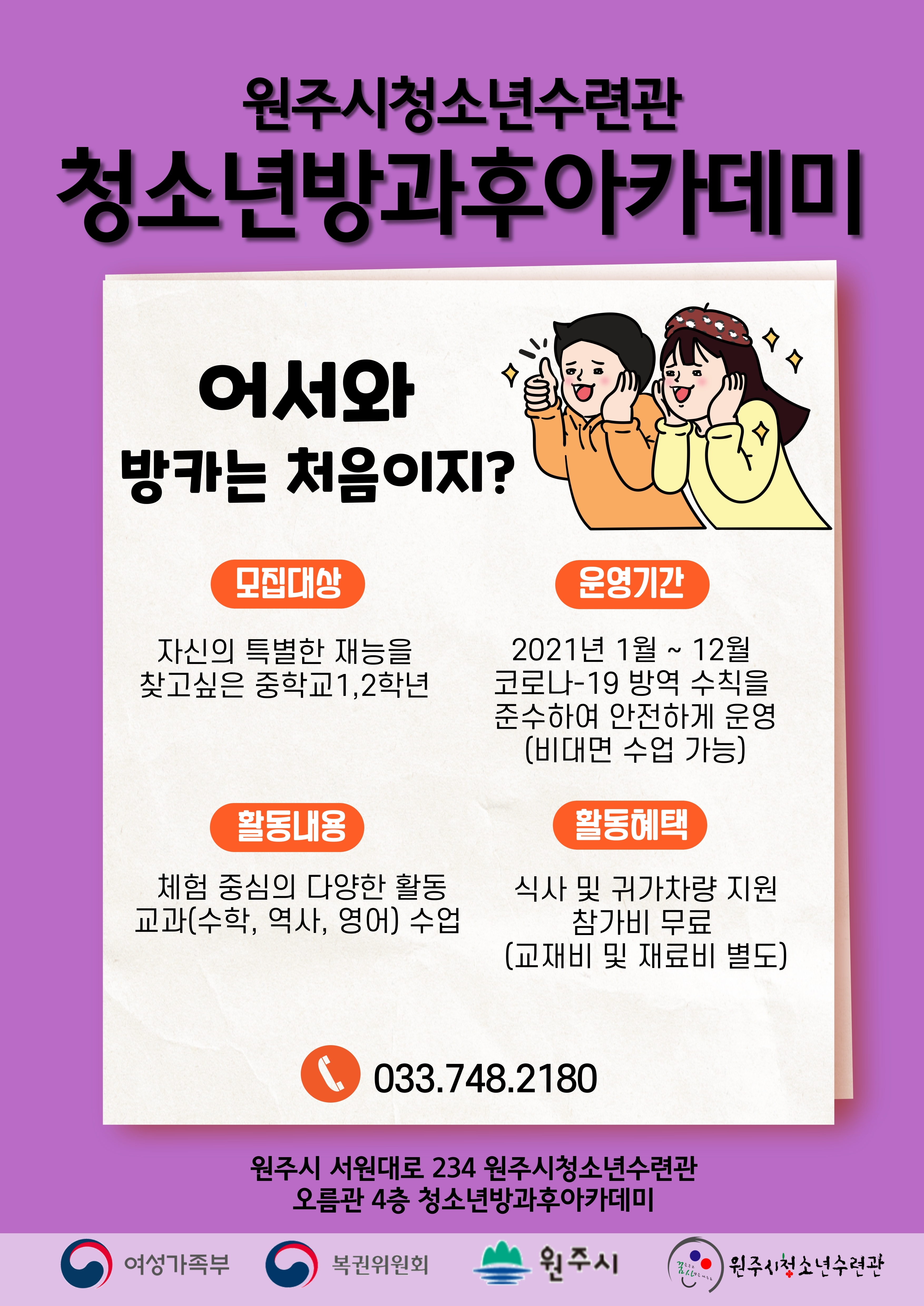 원주시 청소년의 방과 후 돌봄을 비롯한 학습(수학, 역사, 영어), 체험활동(진로, 동아리활동 등), 급식, 귀가 등을 운영하는 청소년방과후아카데미 아름드리와 함께 할  청소년을 모집합니다. 상시모집 중 이며 청소년방과후아카데미에 관련된 궁금한 사항도 안내드립니다.
