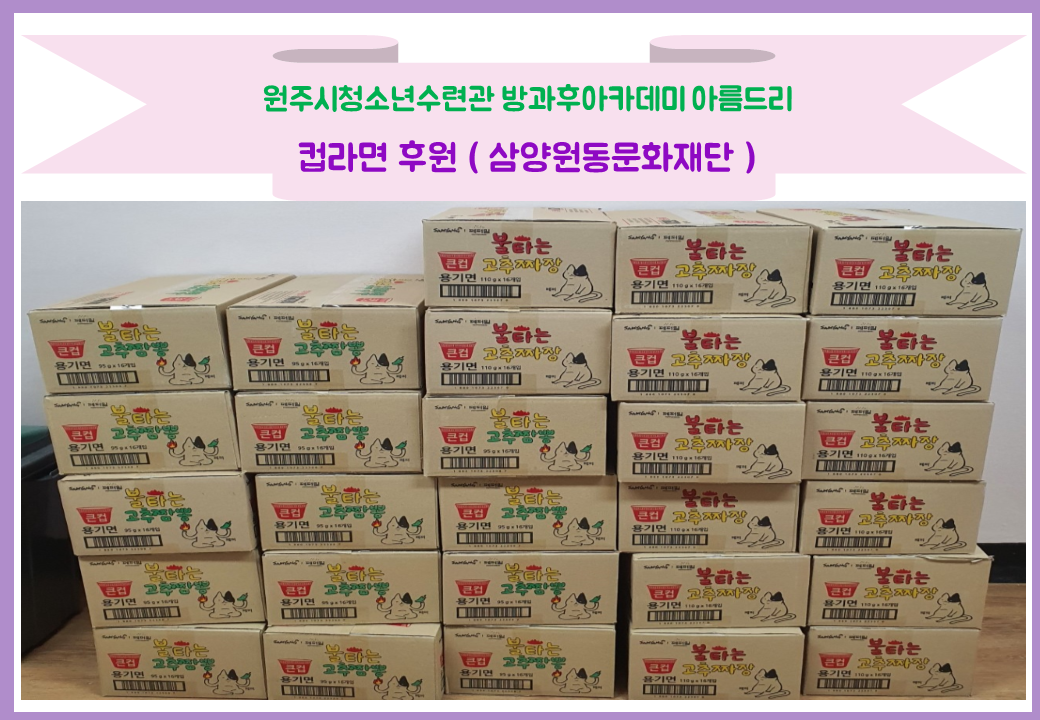 - 삼양동원문화재단에서 컵라면을 후원받아 청소년들에게 식료품 지원하는 날 같이 전달하였습니다.